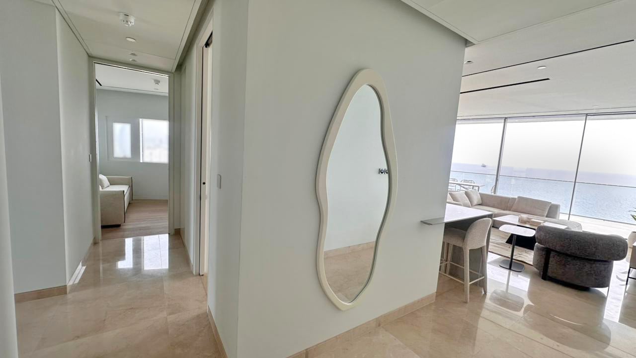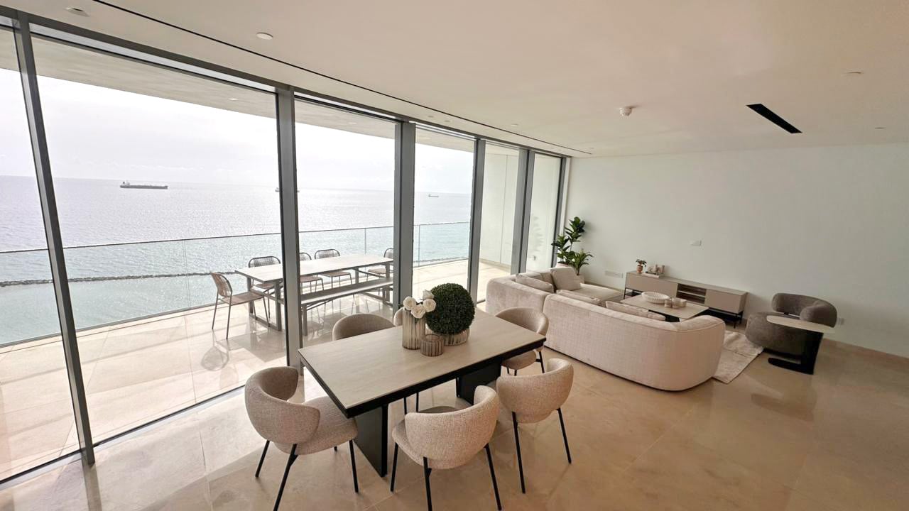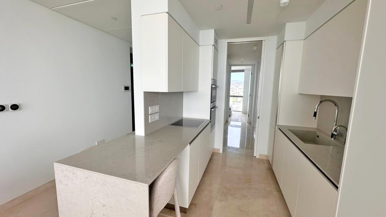 This is an exceptional three bedroom sky residence set within the tallest residential building in this part of the Mediterranean, commanding uninterrupted panoramic sea views and extraordinary natural light. Expansive floor to ceiling glazing opens onto a generous covered veranda creating a seamless indoor outdoor lifestyle designed for refined coastal living and sunset entertaining. The residence offers elegant open plan living and dining, a private master suite and two additional bedrooms idea...