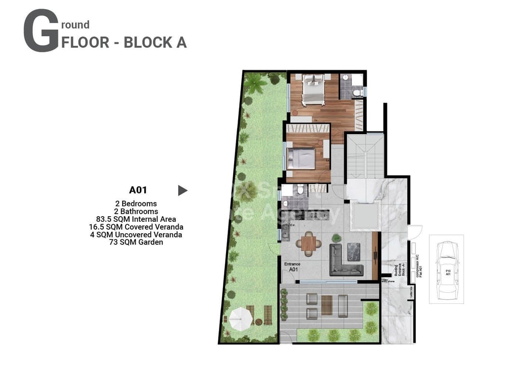 Under Construction 2 Bedroom contemporary and spacious Ground Floor Apartments with covered verandas and large garden areas. The apartments are part of a High - End residential project of 3 Blocks, perfectly located close to all the amenities, 3 min. drive to the beach and only a short drive to Larnaca center. *Apt. A01: Internal area 83m2 - Covered veranda 16m2 - Uncovered veranda 4m2 - Garden area 73m2 - Price 316.000 + VAT *Apt. C01: Internal area 90m2 - Covered veranda 13m2 - Uncovered ve...