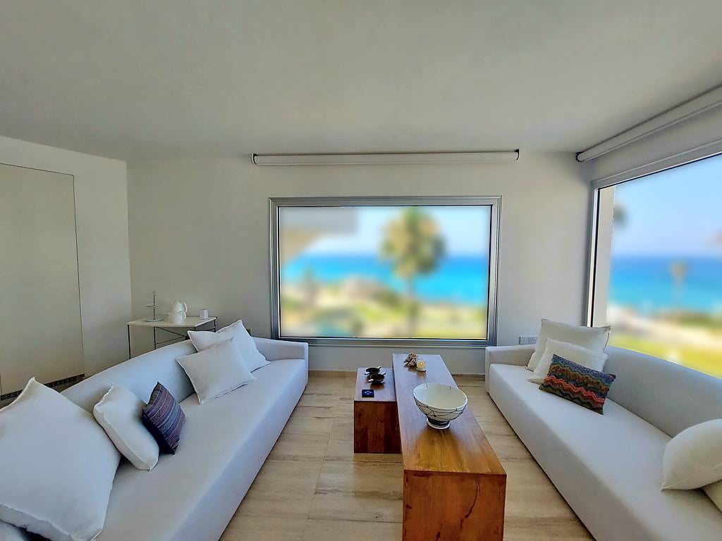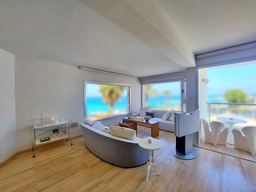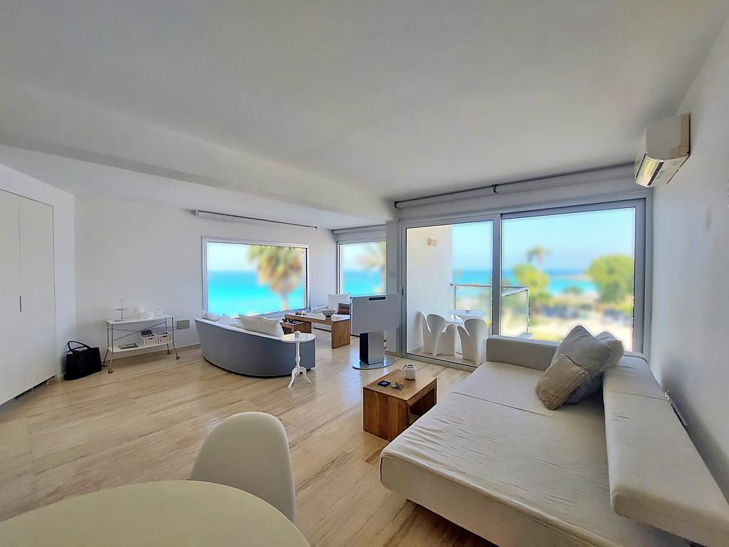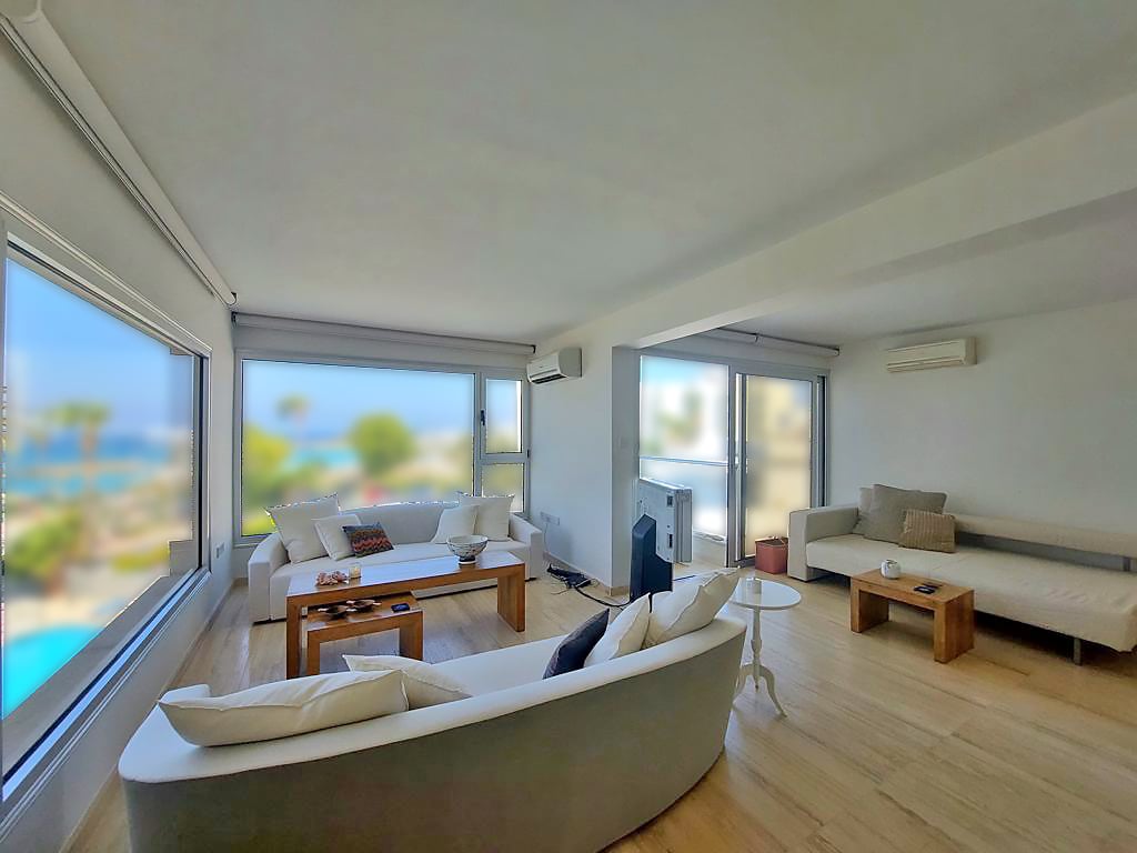 This is a one of a kind sea-view apartment located right on the beach! The apartment is just 50 meters between the two best beaches in Cyprus, one of which has been awarded the blue flag. The apartment has been fully renovated in 2007 and has been outfitted with high-quality marble, floor to ceiling wardrobes, four electric blinds in the living room, and air-conditioning and heating units throughout the entire home. The project has a communal pool and garden! It is close to restaurants, coffee s...
