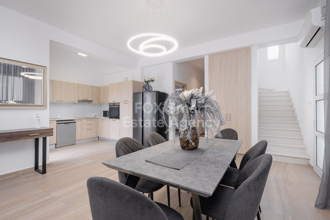 Four bedroom house for sale, in Dromolaxia area close to amenities. The house is under construction with an optional swimming pool. On the lower floor an open plan living, dinning and kitchen area, one bedroom and bathroom. On the upper floor three bedrooms, master bedroom en suite and one whole bathroom. The top has an attic which can be a bedroom with extra cost. The house is next to a green area and will be completed before the end of 2025.