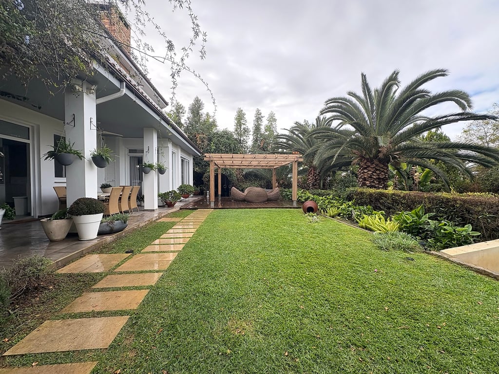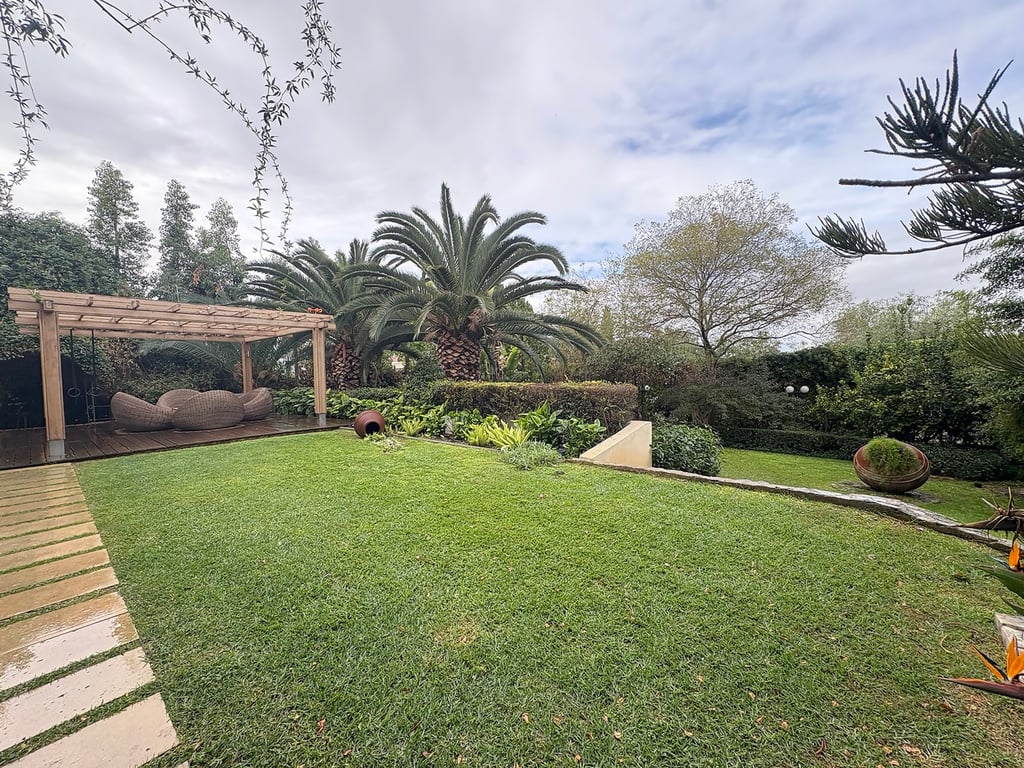 This beautifully renovated home, originally built in 1994 combines modern comfort with elegant finishes and generous living spaces. The ground floor features two spacious living areas, a bright dining area, a large kitchen with breakfast table, a cozy fireplace lounge, a playroom, and an ensuite maid’s room. Upstairs, there are four spacious bedrooms (two ensuite), an additional bathroom, and an open-plan office. Set on a marvelous mature garden, the property offers a perfect blend of indoor-out...