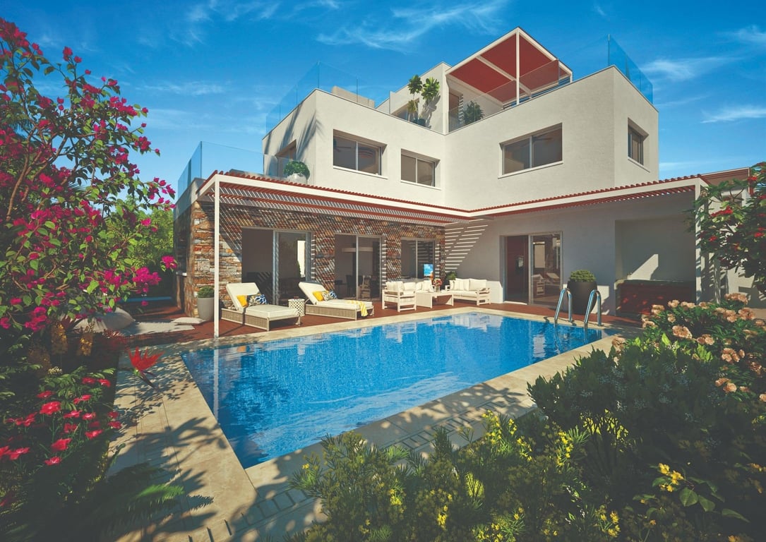 PRICES FROM €795,000+VAT Situated within a brand new and exclusive development in the sought after area of Geroskipou, this sumptuous four bedroom villa comprises of an open plan living/dining area, a separate kitchen, guest w/c and a large bedroom with an ensuite bathroom. All of the ground floor areas have been meticulously finished with top of the range and modern fixtures and fittings one would expect of a property of this calibre. The interior living and kitchen areas effortlessly blend ...