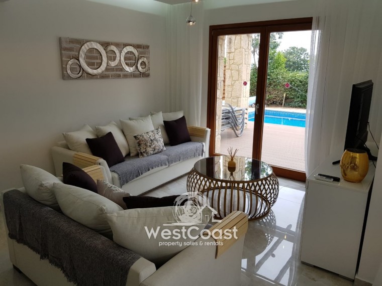 Located in the prestigious, residential Aphrodite Hills Resort, which has an 18 hole, 5 par golf course, health Spa, tennis academy, tavernas, shops & a hotel. This proeprty is on a security, gated cul-de-sac, which is only a few mins walk to all the resort amenities. Driveway, and established gardens. Open plan lounge/ dining/ kitchen, 3 bedrooms, 2 full bathrooms, a heated private swimming pool and garden. External staircase leading up to a full property size roof terrace with views over the 1...