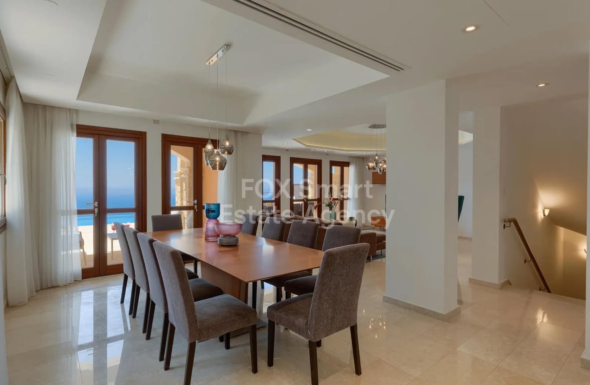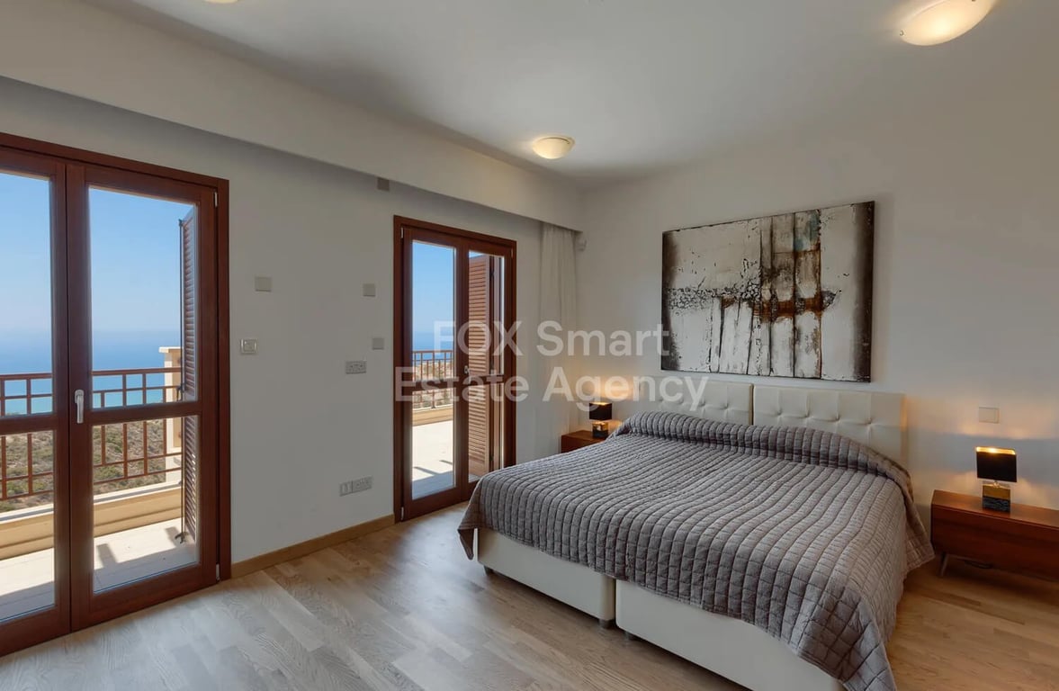 his spectacular 4-bedroom villa is set on a prime location in Aphrodite Hills, offering uninterrupted, panoramic views of the stunning Mediterranean Sea. Designed with luxury and attention to detail in mind, the villa combines modern elegance with comfortable living. A sweeping walkway leads to the grand entrance, where the interior impresses with neutral tones accented by tasteful pops of color and high-quality modern finishes. The contemporary kitchen features high-gloss cabinetry, premium g...