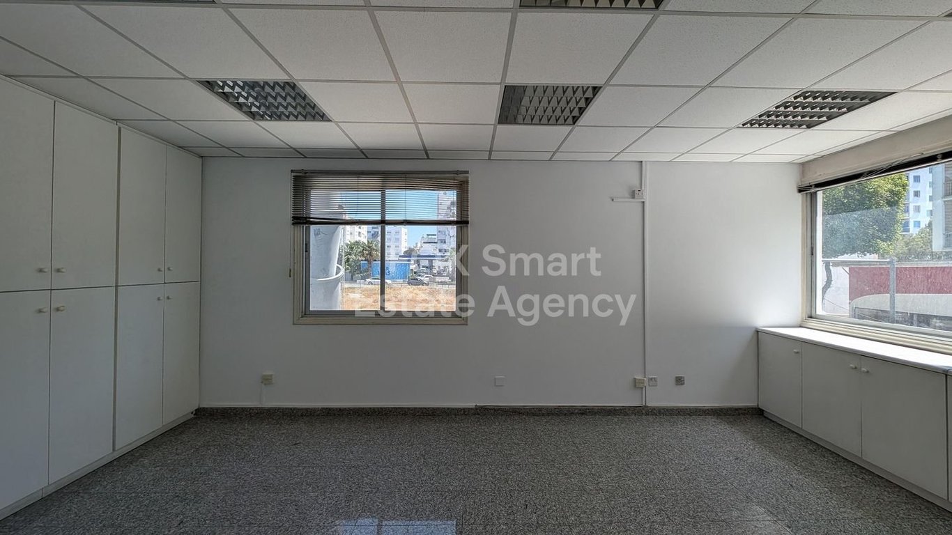 Location • Ideally situated near Spyrou Kyprianou and Digeni Akrita Avenues, this office enjoys a prime position in the heart of Nicosia. • It is within walking distance of the Lykavitos Primary School and the Nicosia Technical School, and is conveniently close to a wide range of amenities and services, including banks, cafes, public transportation, and government offices. External Features • The property occupies the entire first floor of a six-storey commercial building constructed in 1995...