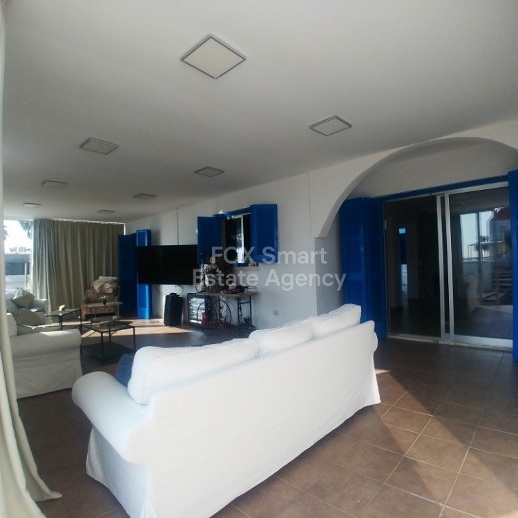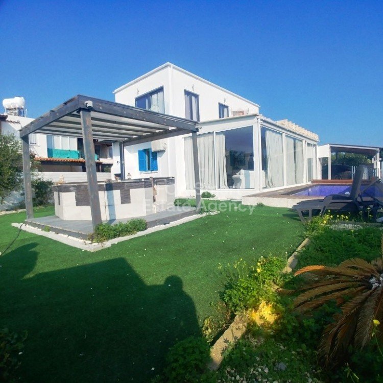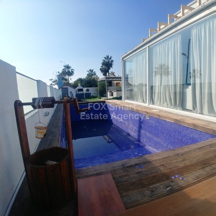 A unique house, located in Pervolia, just a few meters from the sea and with full sea views. Is an ideal holiday investment opportunity or a family house. Is separated to a Ground and to an Upper floor house. Beautiful landscaped gardens with jacuzzi,trees and a private 8x3 metersswimming pool. The ground floor houseinternal areacomprisesof an open plan kitchen with dining/living room, a full bathroom, 2 bedrooms, the guests w.c., the covered and closed with glass doors frontveranda and a priv...