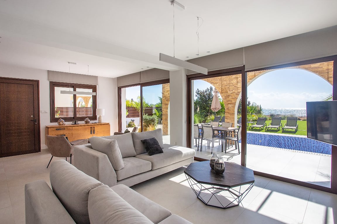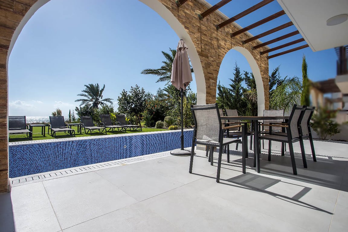 This stunning 5 bedrooms fully furnished beachfront villa located in the serene Ayia Thekla area. This elegant retreat offers breathtaking sea views, direct beach access, a private pool, and stylish interiors, perfect for a relaxing Mediterranean getaway.