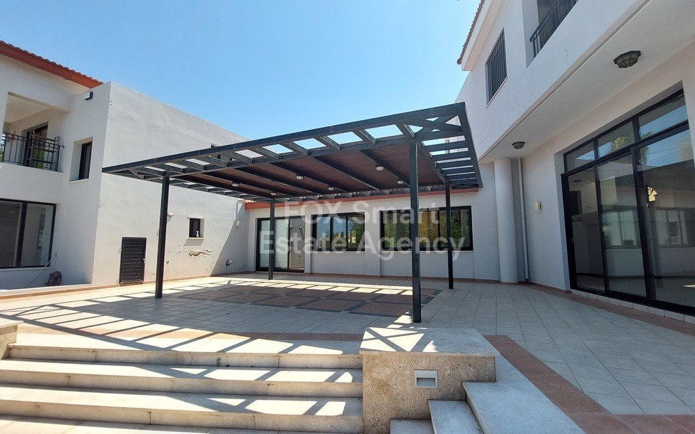 A spacious five-bedroom house in Geroskipou, Paphos, offering 380sqm of living space across three levels. The ground floor includes a kitchen, sitting room, casual dining area, living room, formal dining room, and guest toilet. The first floor features four bedrooms, two with en-suite bathrooms, plus a family bathroom. The basement provides an additional bedroom with private bathroom, a small kitchen, and storage areas. Outdoors, the property boasts a canopy, barbeque area, private swimming poo...