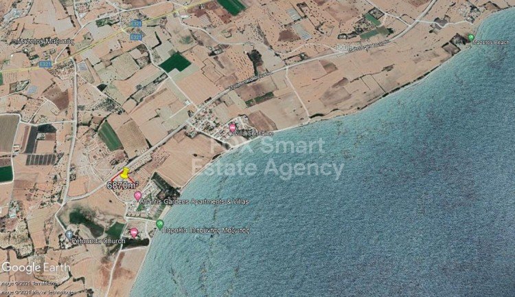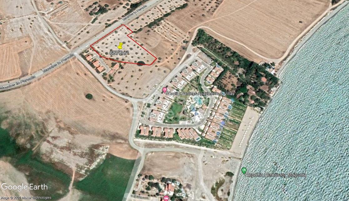 Tourist Land of 6870m For Sale in Mazotos. The property is in T2a zone and is suitable for up to 3 floor buildings, with 45% building density and 20% building coverage. With registered road at the front and just a short walk to the beach. Ideal for development, investment or even for a single villa.
