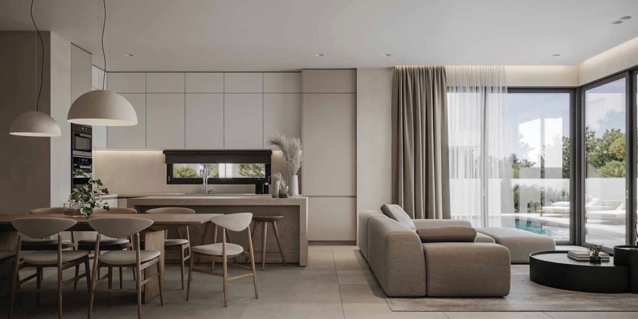 Situated in the cosmopolitan seaside resort of Protaras, in the popular and rapidly developing area of Pernera, and near the new Paralimni Marina, this stunning development embodies luxury, quality and design. The residences boast clean, minimal geometric lines, showcasing a distinctive design and elevated aesthetics evident in the natural tones of both interiors and exteriors. Each villa features a private swimming pool, garden, and a roof garden with captivating sea views. The ground-floor cov...