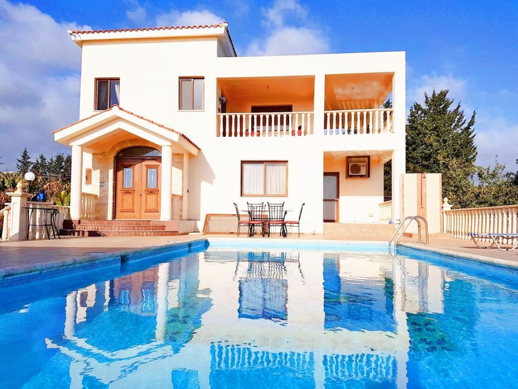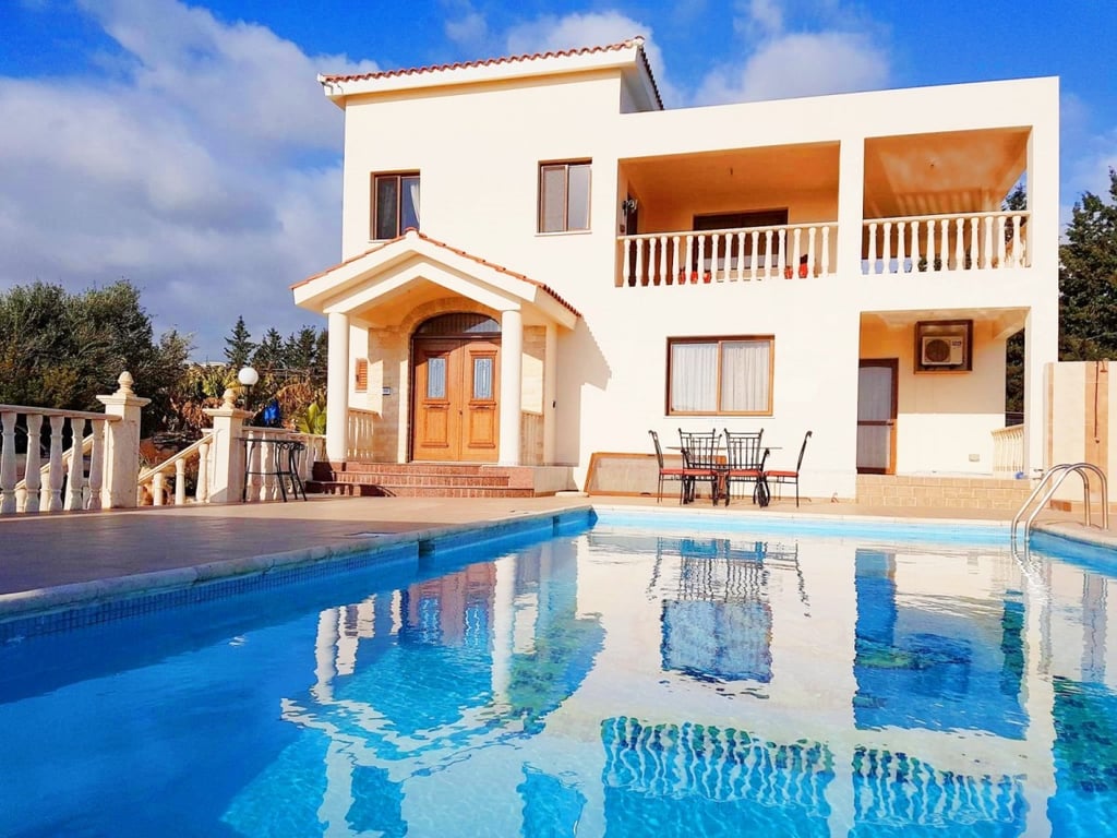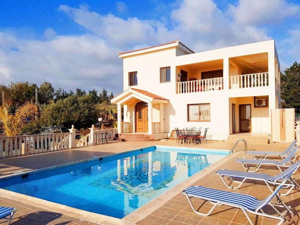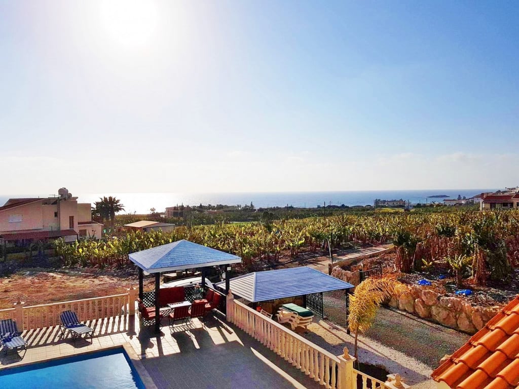 A spacious fully furnished four bedroom villa is for sale in the Sea Caves area. Set in a large plot of land of Banana Plantations this unique property has spectacular views over the coastline and the surrounding countryside. The house has been built on elevated and extensive grounds, it will allure you with its sense of privacy and tranquility. This villa is located merely 5 minutes from Coral Bay resorts. On the ground floor the house comprises of a separate kitchen and dining area, sitting a...
