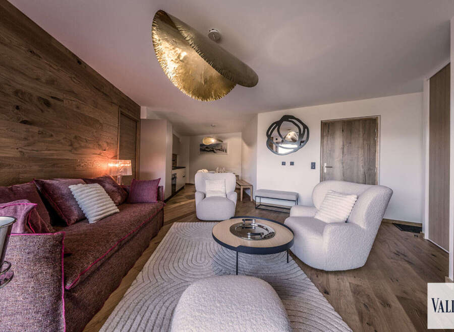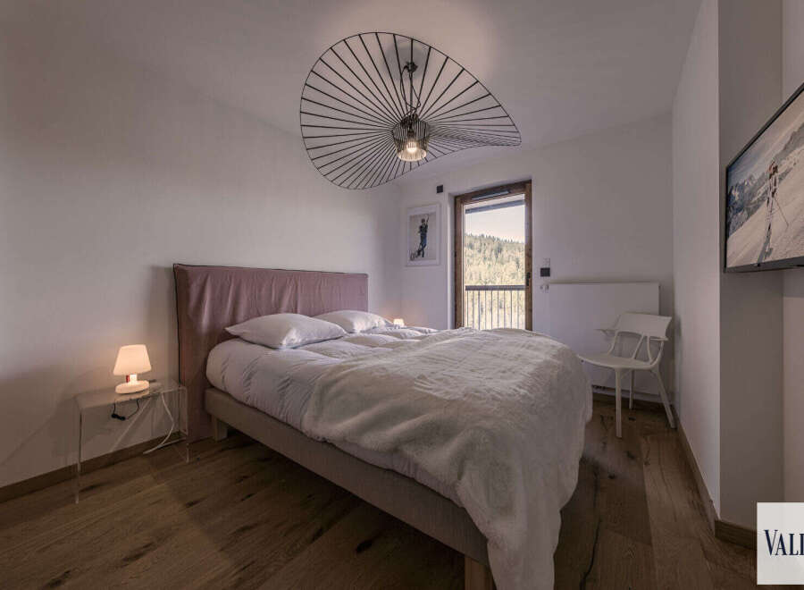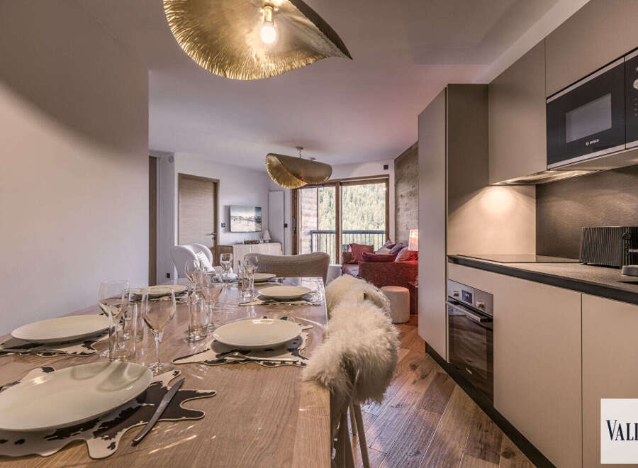 In a recent residence and ski in ski out of Courchevel 1650, discover this superb family apartment, superbly decorated and fully equipped. It has a spacious living room with a comfortable lounge area with TV opening onto a terrace with a panoramic view of the mountains and the valley. Also a modern and fully equipped kitchen with its dining area. Night side, a double bedroom en-suite with its shower room, toilet and laundry room, also a spacious second double bedroom with storage, terrace access...