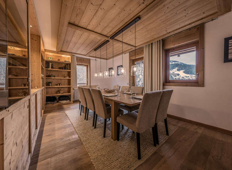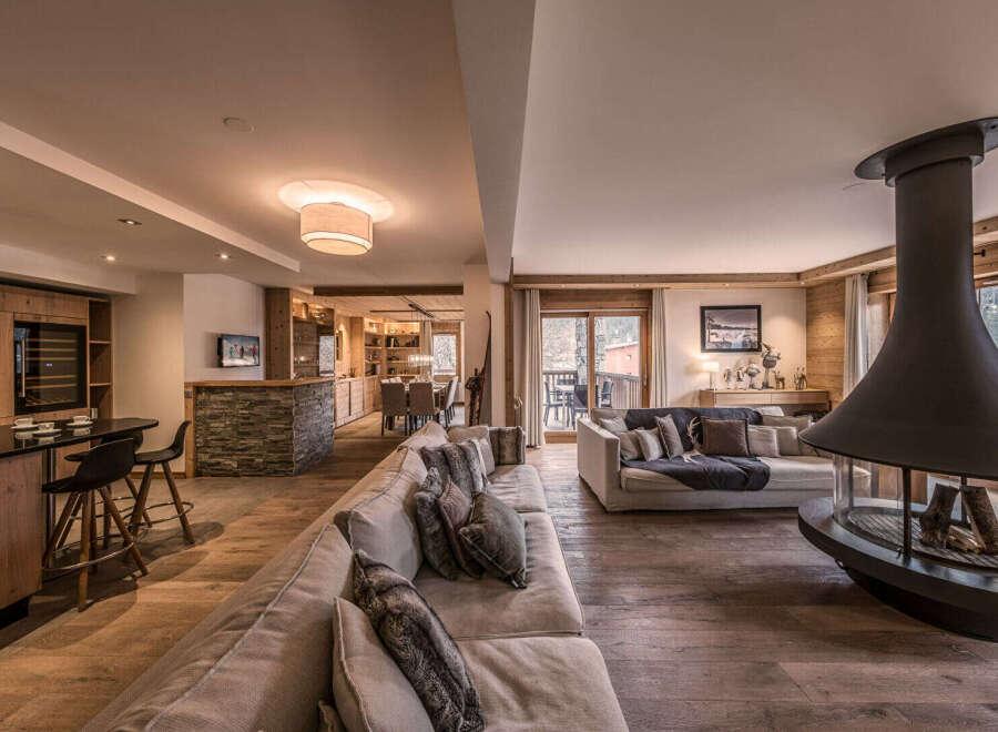 #Wood, stone, and horizon# Located within a recent residence in Courchevel Moriond, this apartment embodies a refined and contemporary interpretation of alpine architecture, combining noble materials, generous volumes, and open views over the surrounding landscape. With a surface area of approximately 137 sqm, the reception space is organized around a vast living area, articulated between a fully equipped kitchen with coffee-time space, a corner dining room with integrated storage, and a genero...