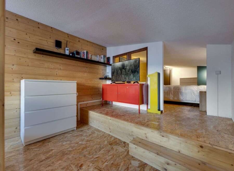 Located on a high floor of a quiet residence in Arc 2000, just a few steps from the ski slopes and close to the resort's shops, this duplex apartment has been fully renovated recently. The layout is thoughtfully designed to comfortably accommodate up to 6 people! It features a spacious entrance with a closet, a 'coin montagne' (bunk area), large storage spaces, a living area with a fully fitted and equipped open kitchen, and a bathroom with a large shower. Upstairs, there is a convertible lounge...