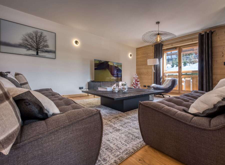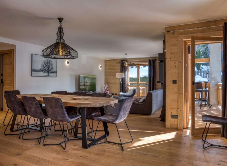 Just 300 meters from the pedestrian street and the Chamois gondola, this exceptional 217 sqm duplex combines comfort and refinement within an intimate residence of only four apartments. From the moment you step inside, the charm is undeniable: exposed solid wood beams and generous volumes create a warm and authentic ambiance. The main living area, bathed in natural light, features a lounge with a fireplace, a dining space, and an open kitchen with a central island, all extended by a southwest-fa...