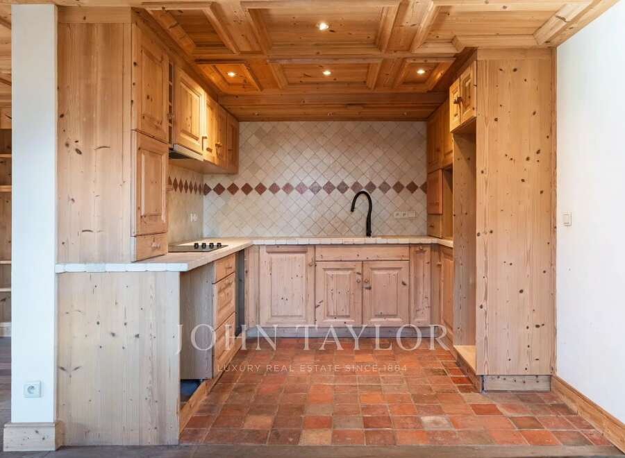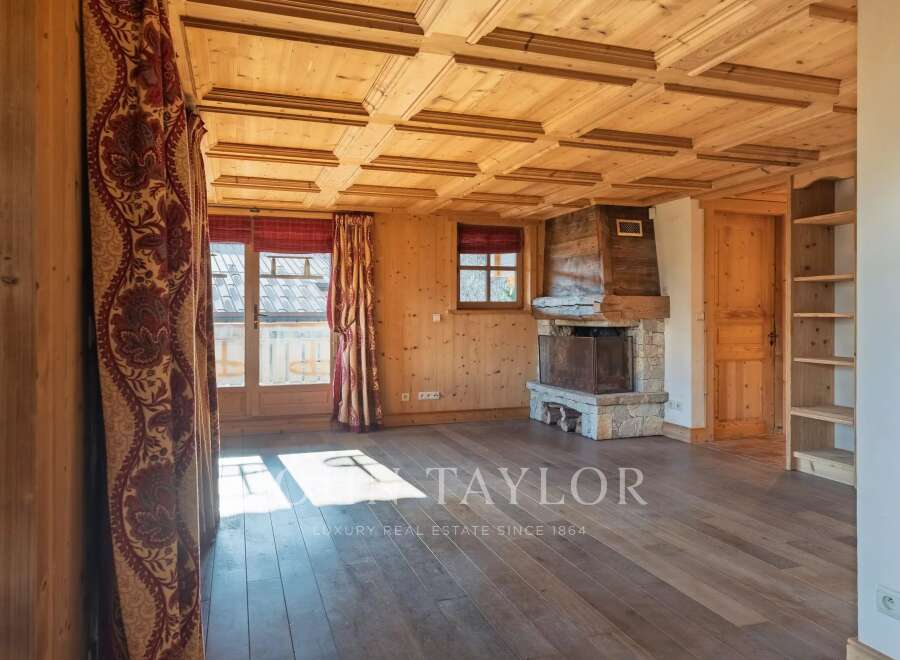 MEGEVE - Apartment close to the center with a surface area of 85.30 m2 (Loi-Carrez) located on the 1st floor with elevator and enjoying an unobstructed view: Entrance hall, kitchen opening onto living room/lounge with fireplace, large terrace, 3 bedrooms, 2 bathrooms. Extras: garage (closed box) and 2 ski lockers.