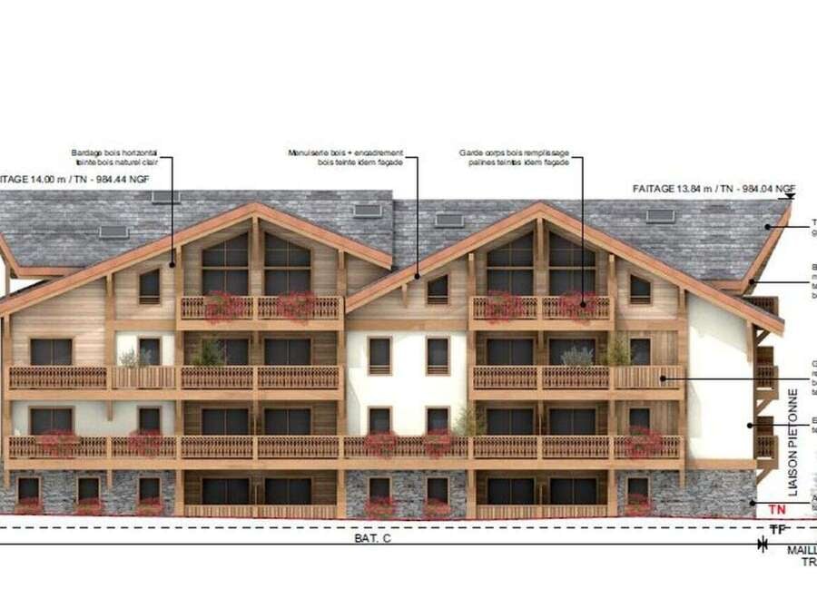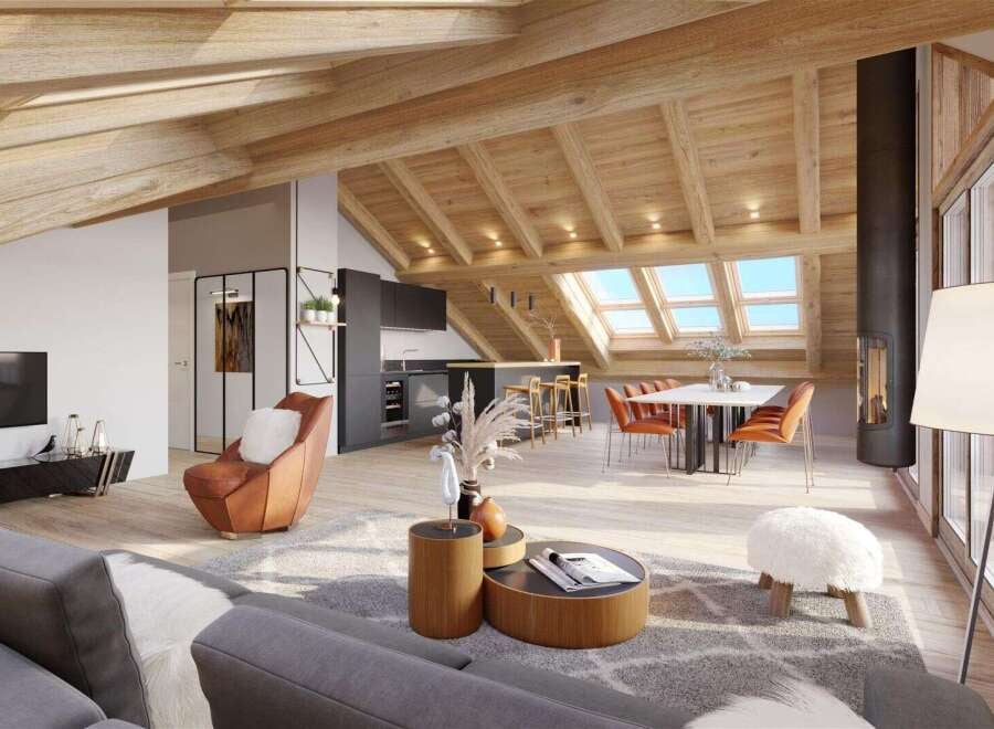 This four-bedroom duplex apartment with cabin is located within the centre of Morzine. The property offers 144.42 square metres of total living space across two levels (R+2 and attic level), with a 19.43 square metre balcony and north-east orientation, featuring views towards the tourist office, Nyon, and Ressachaux areas. Accommodation The duplex comprises an open-plan kitchen and living area (64.45m2) with double-height ceilings and exposed timber beams on the main level, plus three bedrooms ...