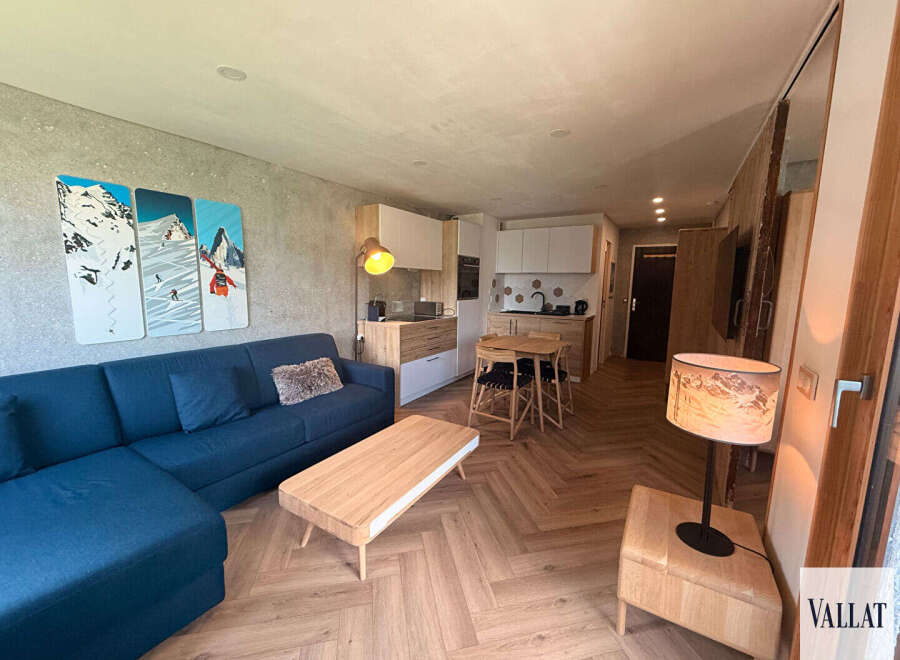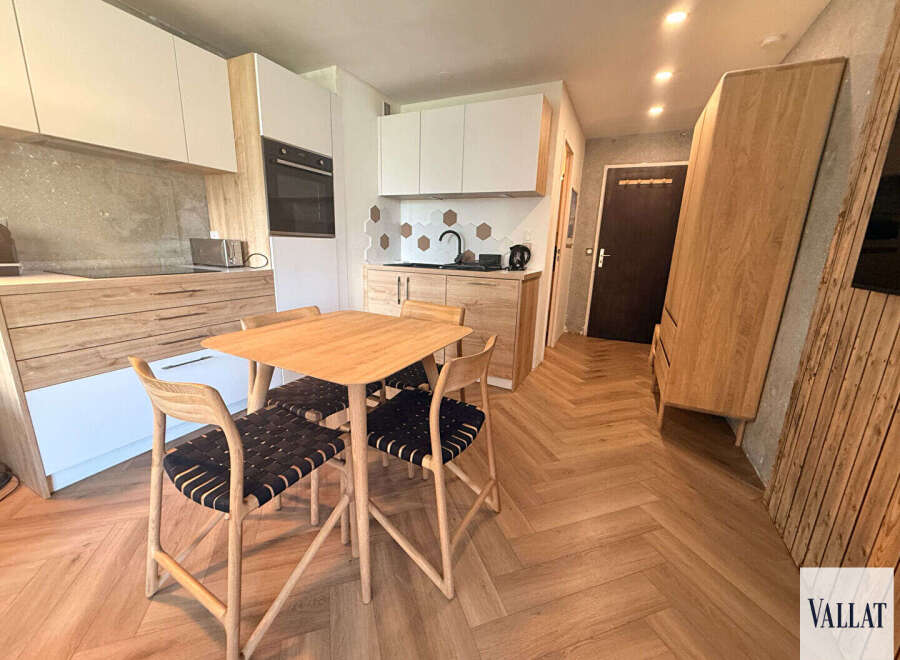 The Vallat agency exclusively offers you this beautiful 1 bedroom apartment completely renovated. The apartment consists of a living room with living room and fully equipped open kitchen, a double bedroom and a walk-in shower room with WC Located in a quiet area, the lake view and the quality of the services of this property will seduce you. Sold with a cellar, a ski locker and a shoe locker. Condominiums of 80 units (No proceedings in progress). Annual expenses : 2973 euros.