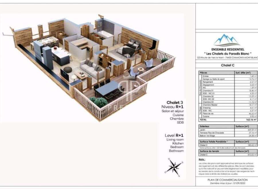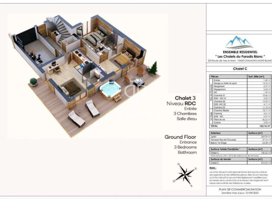 A four bedroom chalet, in a desirable new development of just 3 ski chalets with great views of the Mont Blanc chain in the desirable area of Les Bossons, and providing easy access to the centre of Chamonix. The properties are due for completion in the second half of 2024 at the latest. The interior provides a total surface space of 162m2, including 147 m2 of living space. The chalet sits in a private plot of more than 810m2. Garden level: an entrance, a garage, three bedrooms, 2 shower room / W...