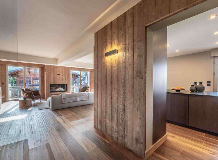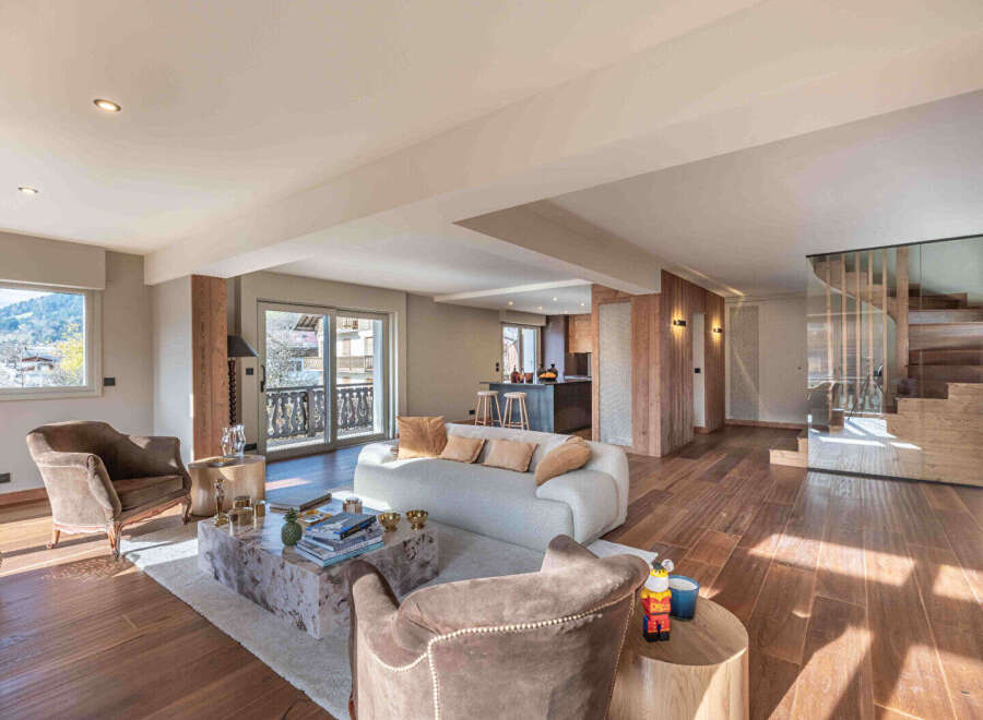 In an area close to the center of Megève, just a few minutes' walk from the village and the ski lifts, this superb, fully renovated, semi-detached chalet of approximately 202 sqm is distinguished by its elegance, light, and unobstructed views of the surrounding mountains. From the moment you enter, you are charmed by a welcoming hall leading to two spacious en suite bedrooms, each opening onto a terrace and a private garden, offering a peaceful and intimate setting. This level also includes a pe...