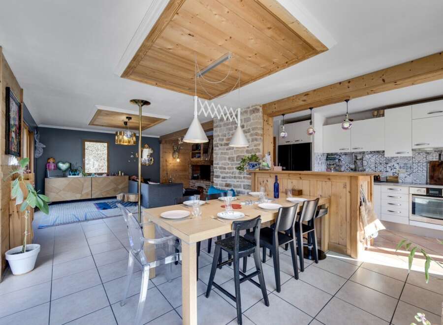 Nestled in the charming village of Sainte-Foy-Tarentaise, this unique 172 m2 chalet offers breathtaking mountain views, south-facing living spaces, and a versatile layout with five bedrooms across multiple levels. Blending authentic Alpine warmth with modern comfort, the property provides a serene lifestyle just moments from ski access and nature trails.The heart of the chalet is a spacious open-plan living area with a feature fireplace and fully fitted kitchen, opening onto a generous terrace ...