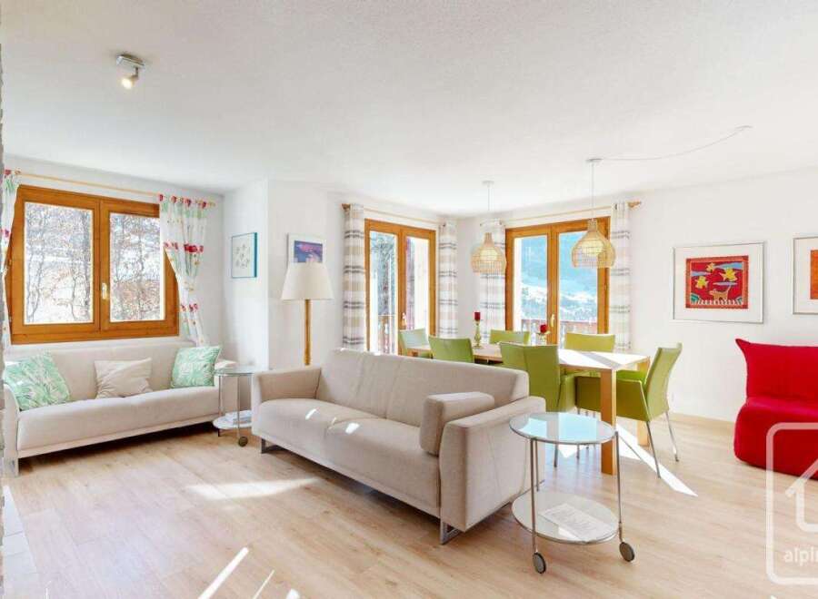 Chalet La Bergerie is a modern three bedroom apartment with exceptional views. Built in 2000, the property is in excellent condition throughout and comprises; **On the ground floor,** an open plan living, dining, kitchen area with access to the sunny, wraparound terrace and balcony, entrance with storage cupboard, WC. **On the first floor,** three bedrooms (two with balconies, all with built-in storage), bathroom with WC, shower room, storage room with washing machine. What really sets this ...