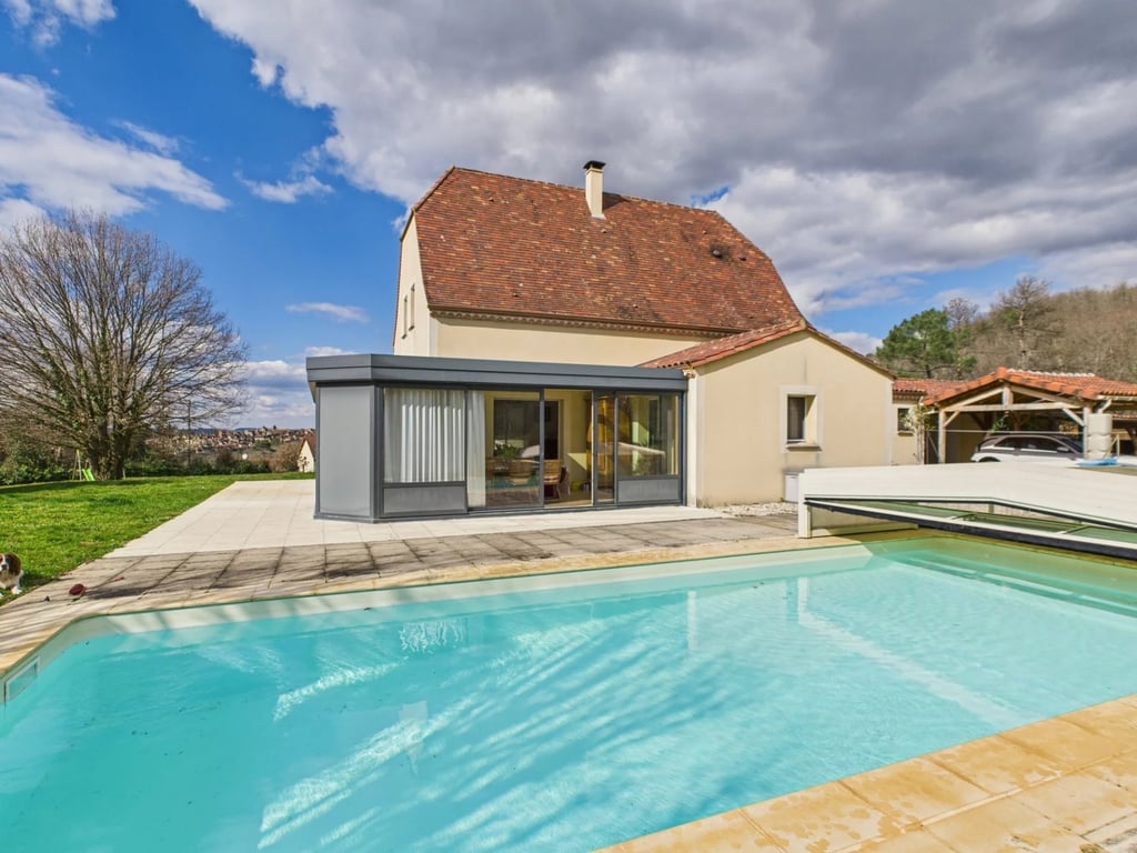 Perched above the stunning bastide town of Domme, this modern Périgourdine-style home (2009) combines charm with comfort. Sustainable features include geothermal heating, solar panels, and a dual rainwater/town water system. Bright and airy living/dining space flows into a contemporary open-plan kitchen and sunlit conservatory. The home offers four bedrooms, including a ground-floor bedroom with en-suite bathroom connected to the office, plus a shower room, two WCs, and a utility room. Outside...