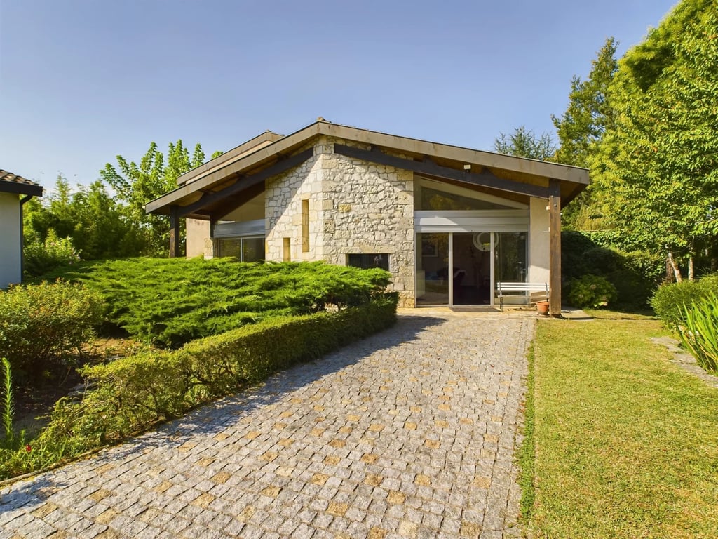 Superb blend of stone and contemporary design for this spacious, light and airy architect-designed house. This beautiful property in the centre of all amenities has many assets. It has a guest house for use as rental accommodation or extra space for family and friends etc. The main house spans around 300 m2 and comprises a bright entrance hall, lounge, study, cosy area with two small lounges, kitchen, utility room, spacious lounge with fireplace, dining room, master bedroom and WC. Two staircas...