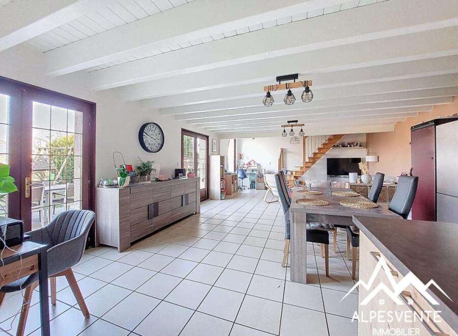 ALPESVENTE vous présente en exclusivité cette charmante maison mitoyenne de 4 pièces, offrant 102m2 habitables, parfaitement agencés pour un confort de vie optimal. Implantée sur une jolie parcelle de 466m2, entièrement clôturée, la maison dispose d'un agréable jardin arboré avec terrasse, exposé Nord-Ouest, idéal pour profiter des extérieurs. Vous serez séduits par la spacieuse pièce de vie de 48m2, baignée de lumière grce à ses larges ouvertures, donnant directement accès à la terrasse et au...