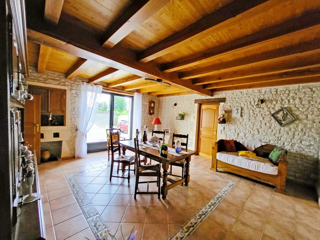 Set in a pretty village, just 15 minutes south of Cognac and an hour from Royan and the glorious beaches of the west coast, this spacious property with heated pool, extensive garage/workshop space and almost 3000m2 of land, is in good condition throughout. Tall, solid, electric gates open into the gravelled front courtyard with ample parking space and direct access to two large, double-height outbuildings, currently used for storage and garaging. An inviting entrance hall with handsome, Charen...