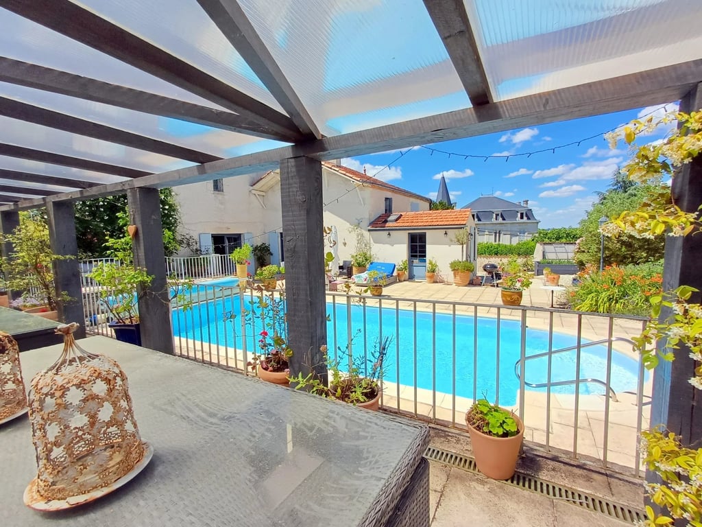 Magnificent 6 bedroom manor house with heated salt-water pool, boasting breathtaking views of the Gironde estuary and across to the Médoc beyond. This imposing house has been immaculately renovated with exceptional taste to include double glazing throughout whilst retaining many period features such as beams and fireplaces. The stunning kitchen with its marble worktops has a stone fireplace and French windows opening onto the glorious terrace and swimming pool. The large imposing salon with its...