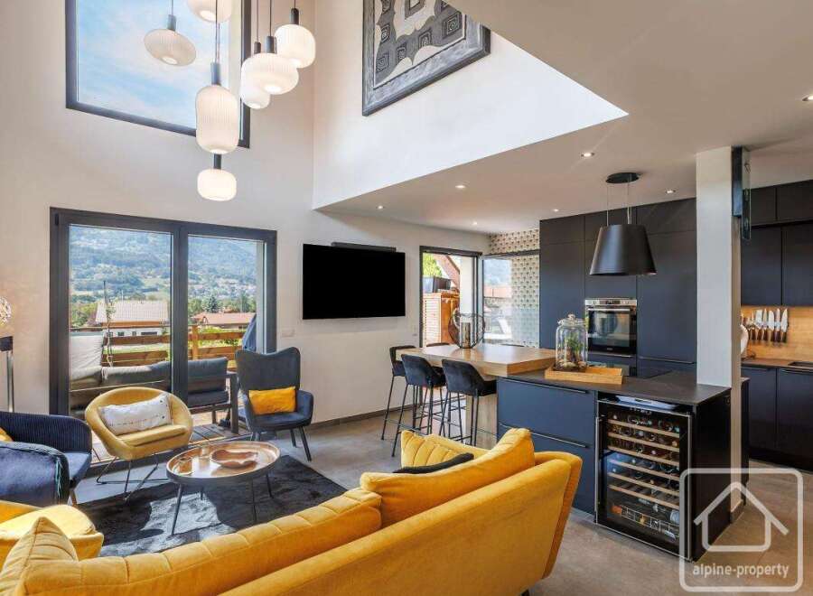 A light and airy south-west facing demi-chalet built in 2021 with a stylish interior created with care and attention to detail, using quality materials. Each room flows easily into the next, with clever storage solutions throughout. The fitted kitchen is a real focal point, complete with granite worktops and a wine cooler, which opens onto a stunning lounge and dining area with a 6 metre high cathedral ceiling and feature pendant light fitting. Large french windows facilitate indoor/outdoor liv...