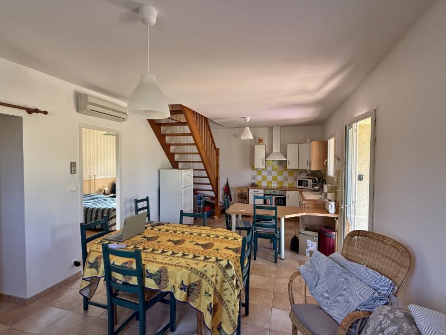 THE HOUSE / GARDEN FLOOR : Living room with fitted kitchen, opening onto a 27 m2 south-facing covered terrace, bedroom with cupboards 13 m2, shower room 4.5 m2 and separate toilet.UPSTAIRS : Two bedrooms (12.5 and 11.5 m2), one with a 3.5 m2 shower room, landing and separate toilet.THE EXTERIORS : This semi-detached house is located within a 14-unit condominium complex on a plot of land covering more than two hectares. It features a large infinity pool with a paddling pool for children, a relax...