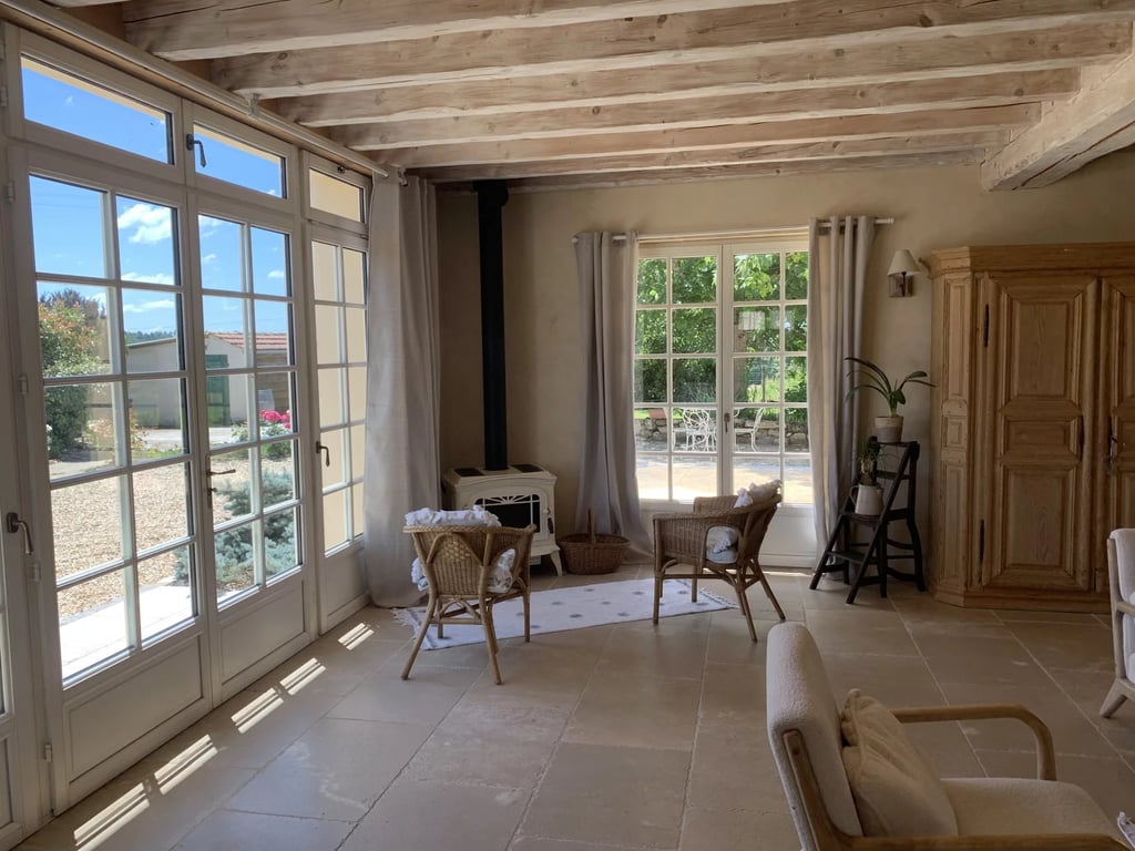 This pretty stone house has been tastefully renovated, and the colours and materials used make it very soothing. The living room has a double aspect, providing plenty of natural light. The house currently has 4 bedrooms, including a suite with open-plan bathroom and dressing room, and 2 shower rooms. If you need more space, an extension to the rear of the house could be possible (subject to necessary permissions). Access to the property is via an electric gate. On entering, you will find pa...