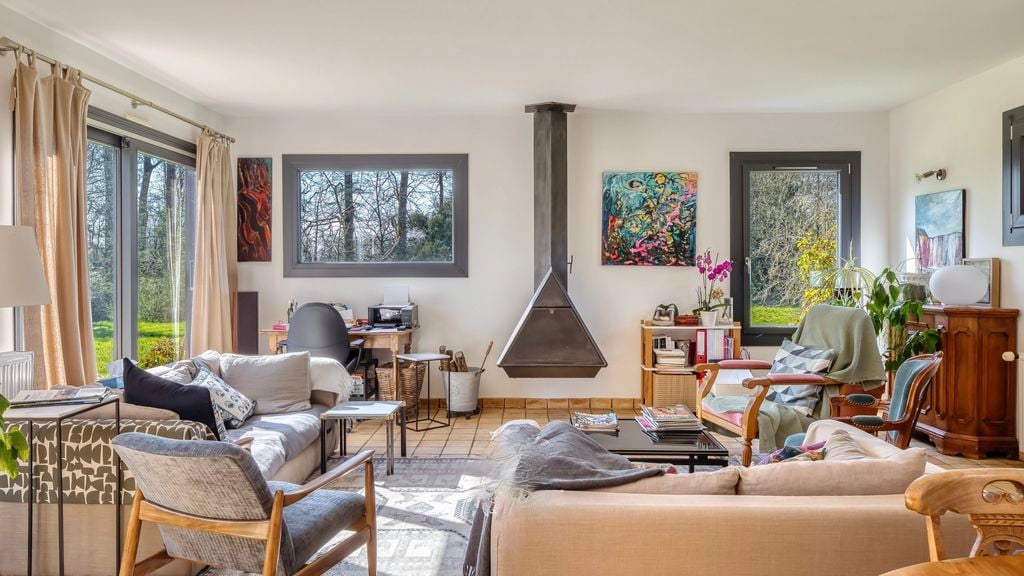 Situated up a private treelined driveway this contemporary 5-bedroom house is a highly efficient, sun-filled hide-away in the Normandy countryside. Updated kitchen and windows, ground-floor bedroom, wood-burning stove and modern living spaces. Just 5 minutes from local amenities in Yerville.There is a total 140m2 habitable space. Here's the layout:Ground floor:Open plan living area floor to ceiling glazing and locally sourced terracotta tiled flooringKitchen (renovated in 2021)Sitting room with ...