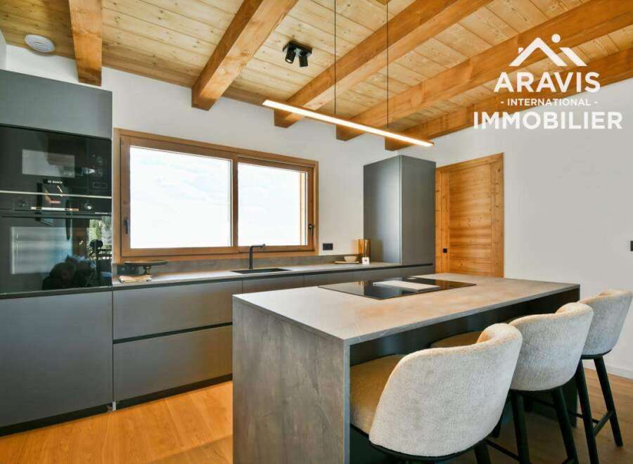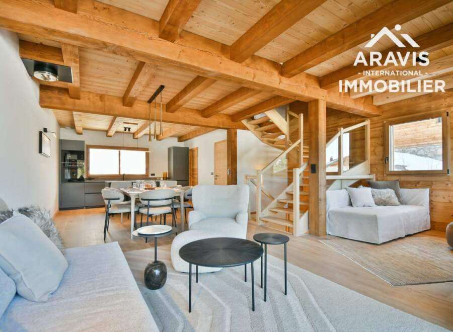 Half-chalet in a new program at the Col de la Croix-Fry, harmoniously integrated into the landscape and surrounded by green fir trees. With an area of 107 m2 plus a garage. The large living room is decorated with a fireplace, in anticipation of long evenings by the fire. This chalet benefits from a spectacular view towards the peaks of La Tournette. Two-sided roof, marriage of stone and wood, the architecture is inspired by the traditional houses of Manigod, made up of a simple wooden volume pla...