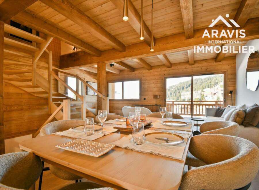 Half-chalet in a new program at the Col de la Croix-Fry, harmoniously integrated into the landscape and surrounded by green fir trees. With an area of 109 m2 plus a garage. The large living room is decorated with a fireplace, in anticipation of long evenings by the fire. This chalet benefits from a spectacular view towards the peaks of La Tournette. Two-sided roof, marriage of stone and wood, the architecture is inspired by the traditional houses of Manigod, made up of a simple wooden volume pla...