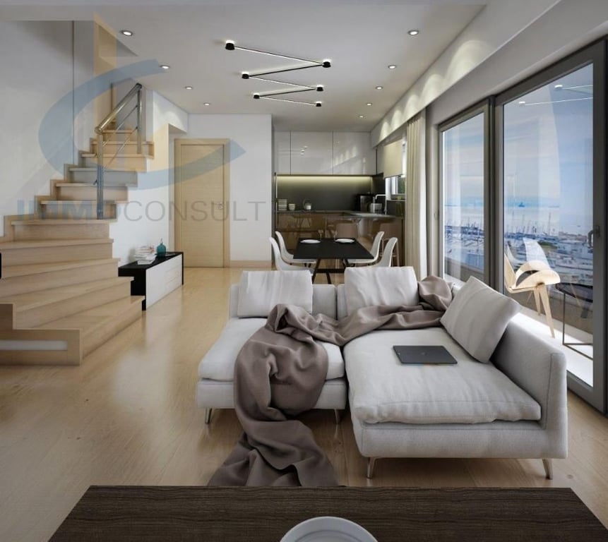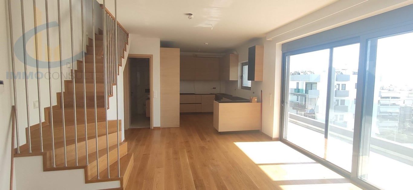 Ready-to-deliver penthouse maisonette 3rd + 4th + 5th floor with use of a 40 sqm terrace, all floors with unlimited and unobstructed sea view 150 m from the beach of Alimos. The maisonette on the 3rd floor is 71 m2 and consists of a living room (with an energy fireplace), a kitchen, a single dining room, 1 bedroom, 1 bathroom and a wc and it communicates with the 4th (loft) 37 m2 with an internal staircase. The 4th floor has a living room, 1 bedroom and a bathroom. The 5th floor is an independen...