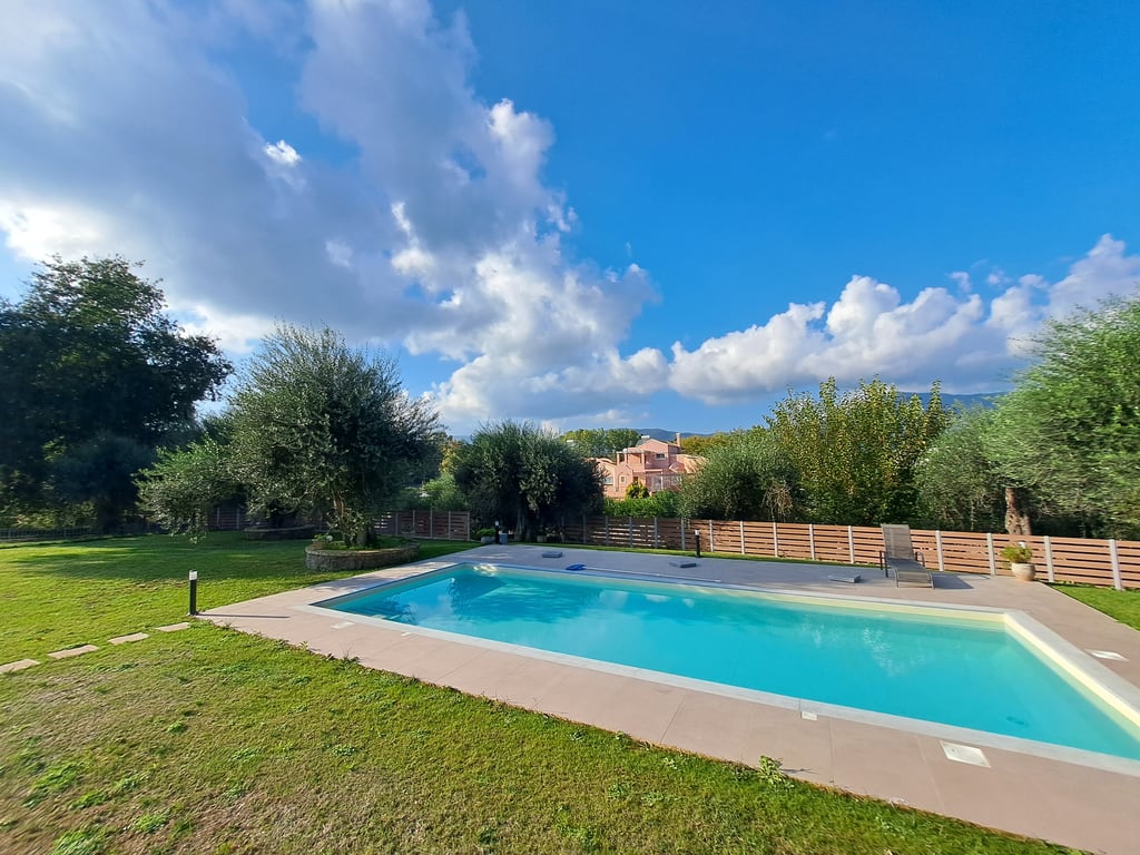 Chase Real Estate Corfu are delighted to bring this beautiful 500m2 villa with 6 bedrooms, 5 bathroom and beautiful landscaped garden with a private pool.This property comes to the market in excellent condition and is ready to move into right away.The property is split into two separate properties, the large house has 4 bedrooms, an office, 3 bathrooms and a large open plan living space and kitchen. You can access a large wooden decking area with an exterior BBQ, A sheltered dining space & a Jac...