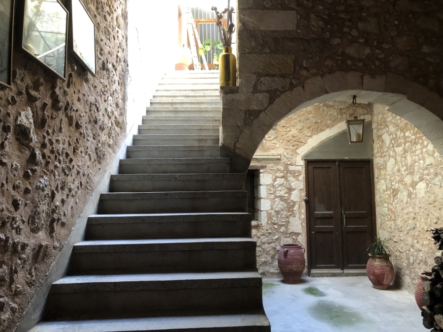 A large 403.45m2 house, set on 2 levels with a courtyard, a big veranda and a garden The property is located in a small paved street, in the heart of the old town of Rethymnon. The 231 m2 ground floor, which is stone built, consists of a courtyard and 3 large storage rooms that can be turned into studios or bedrooms. They have great potential to become beautiful living areas. A staircase leads to the 172 m2 first floor which consists of a small storage room, an independent studio and the main a...