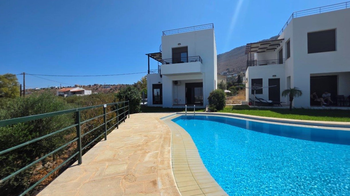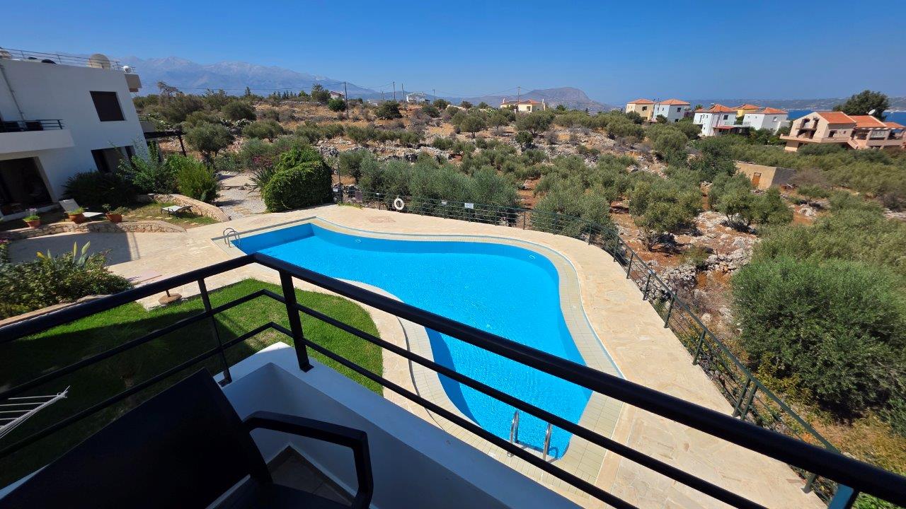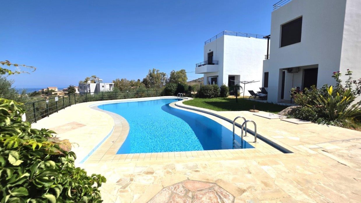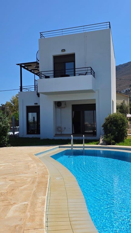 Kokkino Chorio.Sea view luxury property for sale with shared pool on Crete modern 2-Bedroom Villa with Panoramic Sea Views and Shared Pool This modern 2-bedroom, 1-bathroom villa of 80 sqm offers outstanding sea views, multiple outdoor living areas, and access to a large, well-maintained communal pool. Ground Floor The property is designed with an upside-down layout. The entrance hall leads to two spacious double bedrooms, both featuring floor-to-ceiling fitted wardrobes and wide glass patio ...