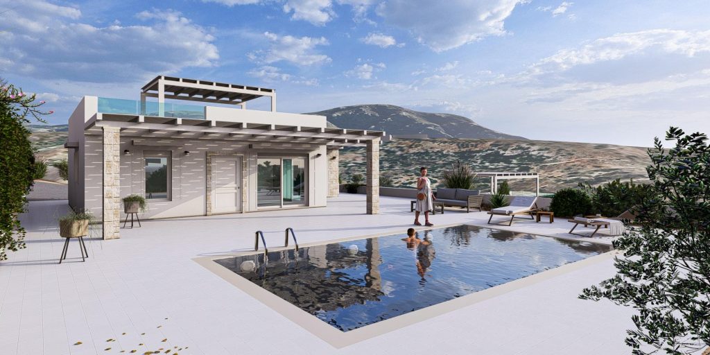 Set in the seaside resort of Makrygialos this is the sale of purposely built 2 bedroom detached bungalow villas on private plots of land of 1000m2. Each villa comprises 2 double bedrooms with fitted wardrobes and access to covered terraces, one of the bedrooms with en-suite shower room, a shared shower room, a fitted kitchen/diner room fitted with ceramic tiles with access to a covered terrace and a living room. An external staircase leads up to the large roof terrace with services connected t...