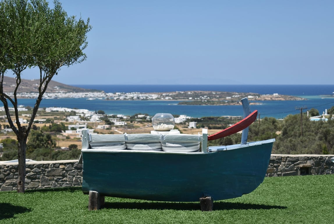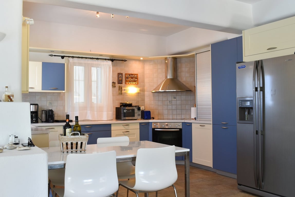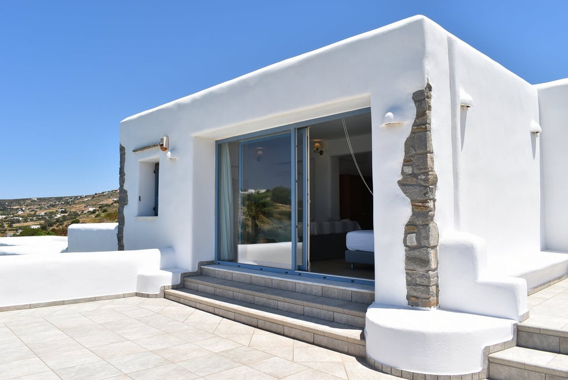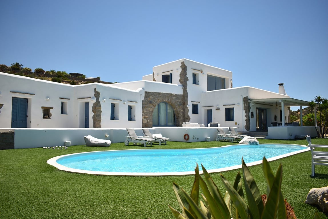PAROS - SOTIRES: Cycladic style Villa of 507sqm on a plot of 4.600sqm is for sale. This beautiful Villa of excellent construction consists of 5 bedrooms, 5 bathrooms, 2 kitchens lounge / dining room on 2 levels with fireplace, offering unlimited and unobstructed sea view. It also has an independent guest house of 65 sq.m.,fitness room, playroom with billiards and ping pong, full bbq indoor and outdoor, tennis court, swimming pool, air conditioning, large beautiful garden with bar and dining room...