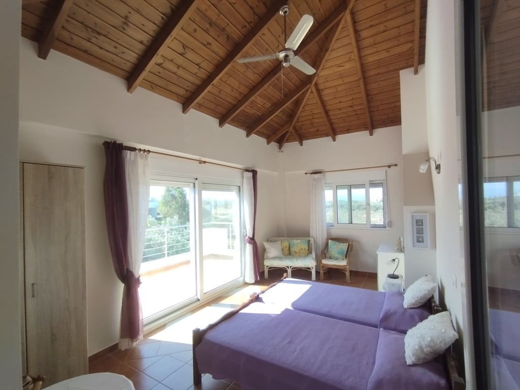 This is a spacious villa for sale in Akrotiri, Chania, Crete, located in the seaside village of Stavros. The property has a total living space of 153 m2 sitting on a 4150 m2 private plot, developed over 2 floors plus basement, featuring 4 bedrooms with private balconies and 3 bathrooms. There is a fully equipped kitchen, an open-plan dining and living area with a fireplace and direct access to an expansive balcony with amazing panoramic views of the mountains, the beautiful garden and the pool....