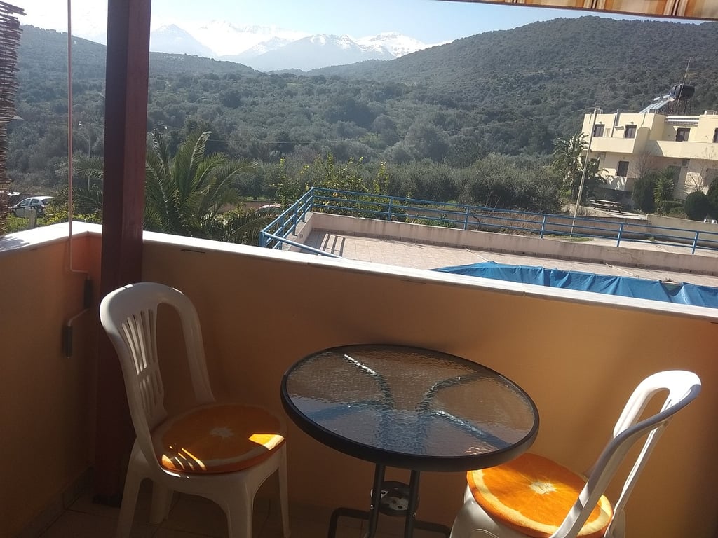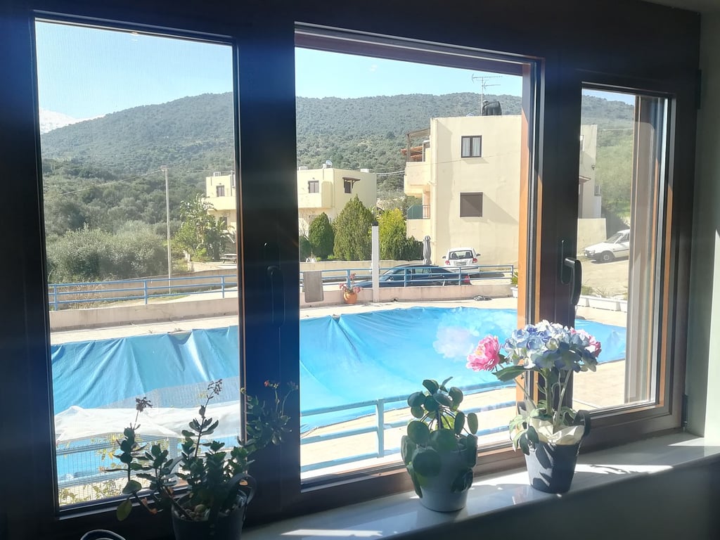 This 2-bedroom apartment for sale in Apokoronas Chania Crete is located in the village of Stylos, in a quiet area with amazing valley and mountain views. It has got a surface of 60sqms and it is part of an apartment building, which consists of 15 units. This apartment features 2 bedrooms, one bathroom, a kitchen, an open plan dining/living area and one covered balcony. The living area has access to a pergola covered balcony with marble tops and shade blinds, overlooking the pool and the impressi...