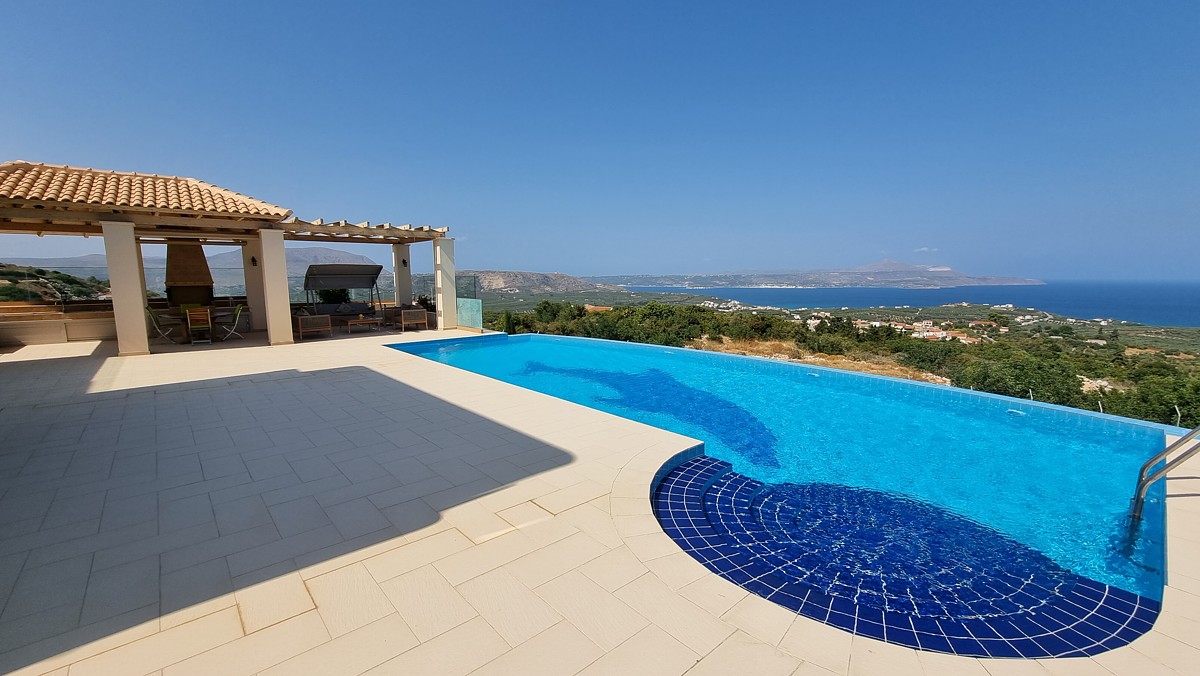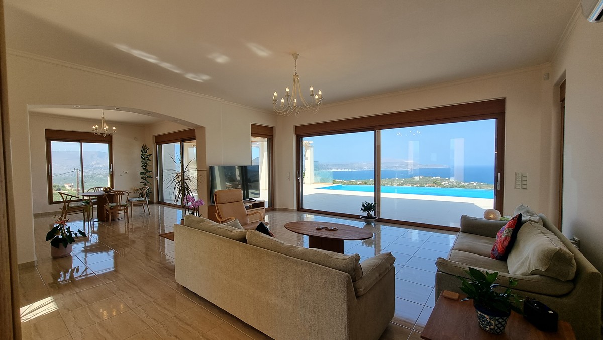 This luxury villa for sale in Apokoronas, Chania is located in the village of Tsivaras on a rare, elevated location with panoramic views. The unobstructed 360-degree view of the sea and the countryside is combined with the view of the White Mountains towards the other side. The plot it is built on, covers a surface of 4,010 sqms. The design and quality of construction of the property are truly unique, as well as the position of the plot. On the ground floor, the villa features 2 bedrooms, 2 kitc...