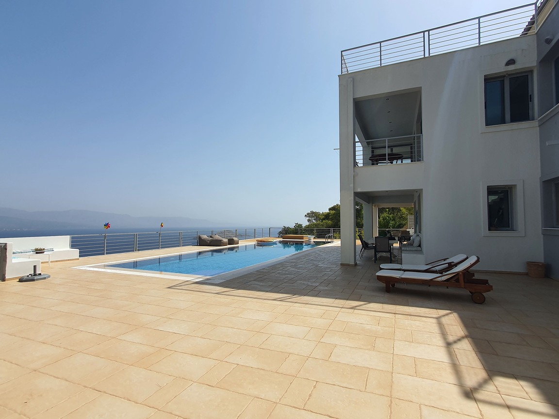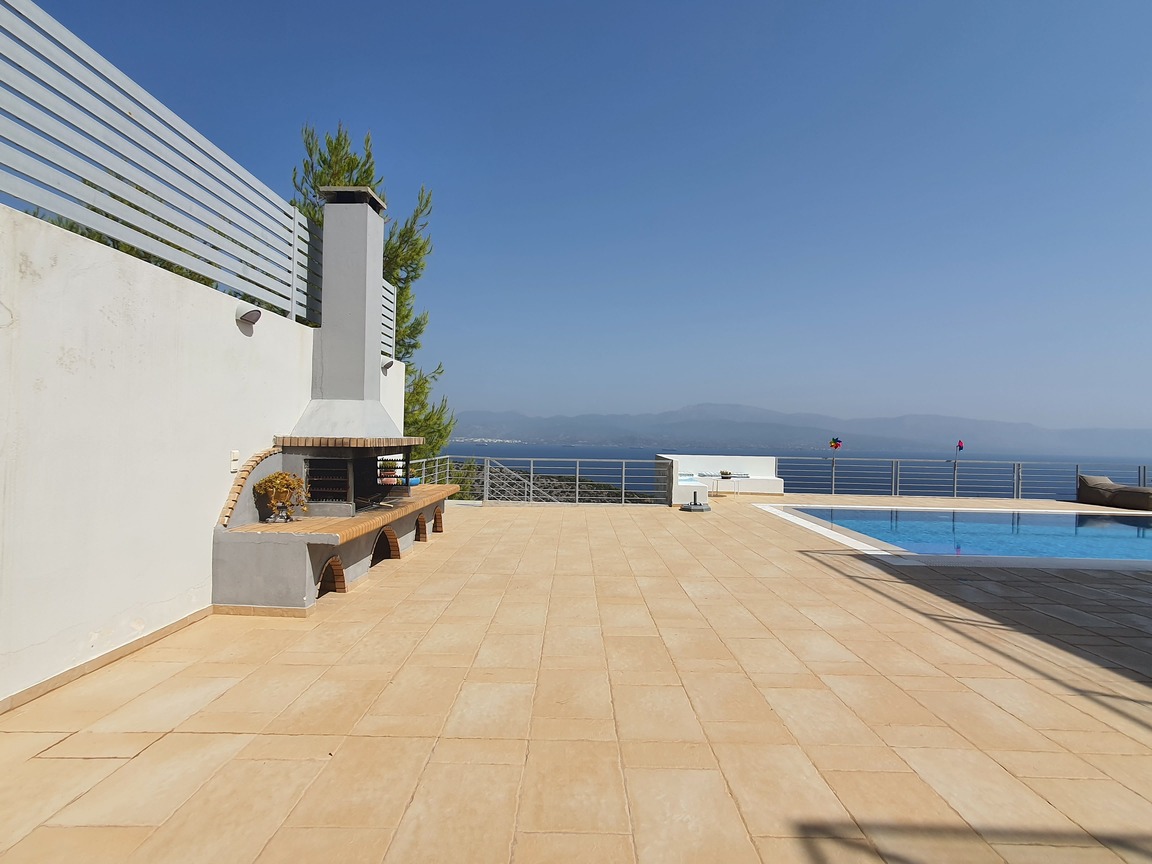 Inside the nature-covered Amoni you find this independent house of three levels with a total surface of 327 sqm, on its own plot of 1,100 sqm. The Villa The Villa is a modern house with simple lines and large openings toward the sea and the Corinthian gulf. The property is found in the pine forest offering absolute privacy and endless, unobstructed views. First level: large living room with fireplace, kitchen, 1 master bedroom with a large bathroom, WC, and another bedroom with a separate dres...
