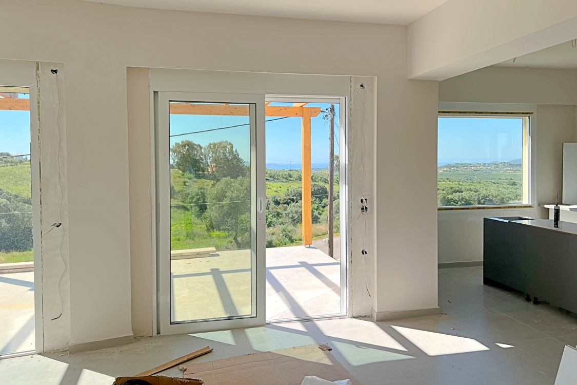 This villa in the tranquil village of Evangelismos, overlooking an olive grove and the Ionian Sea, is at the final stages of its construction and will offer comfortable and spacious accommodation for families and groups of friends. Developed over three levels and a total of 136 sqm (116 sqm living spaces and 20 sqm storage) on a 488 sqm plot, the ground floor of the house is 58 sqm and consists of two bedrooms with direct access to a covered spacious veranda which enjoys beautiful views to the s...