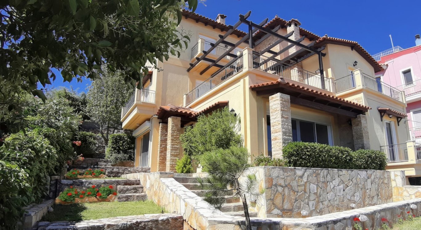 Enjoying panoramic vistas of the South Euboean Gulf from dusk to dawn, this villa is close to Athens and the island of Evia. The 320 sqm residence is developed on a 420 sqm plot and offers 220 sqm of living and 100 sqm auxiliary spaces. The main house unfolds over three floors and provides a total of five bedrooms and three bathrooms, as well as a living room with an open-plan kitchen. The main living room on the ground floor and the master bedroom on the first floor are fitted with a fireplace,...
