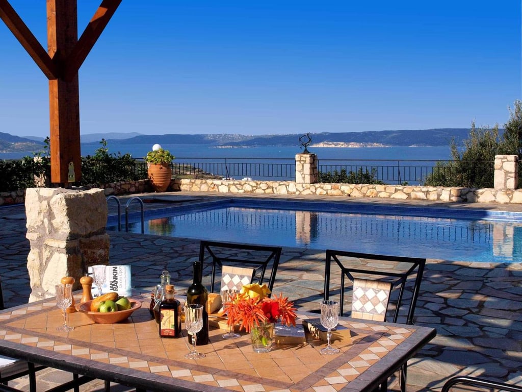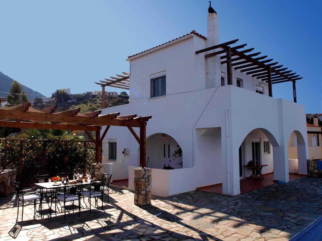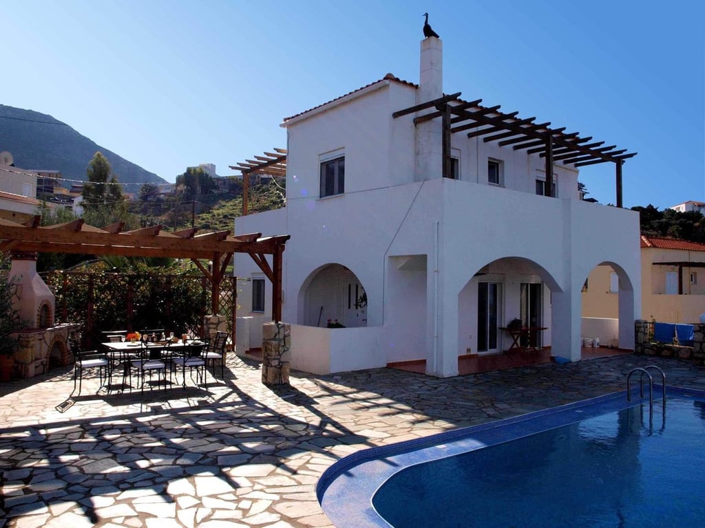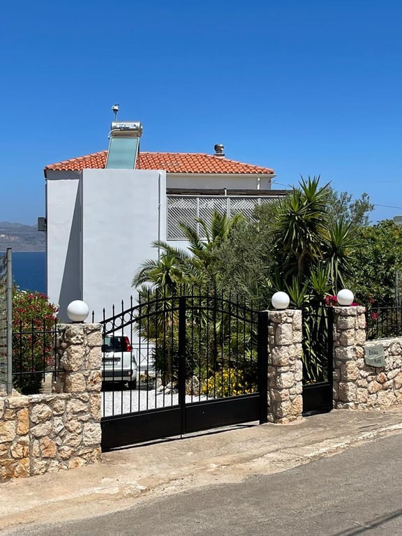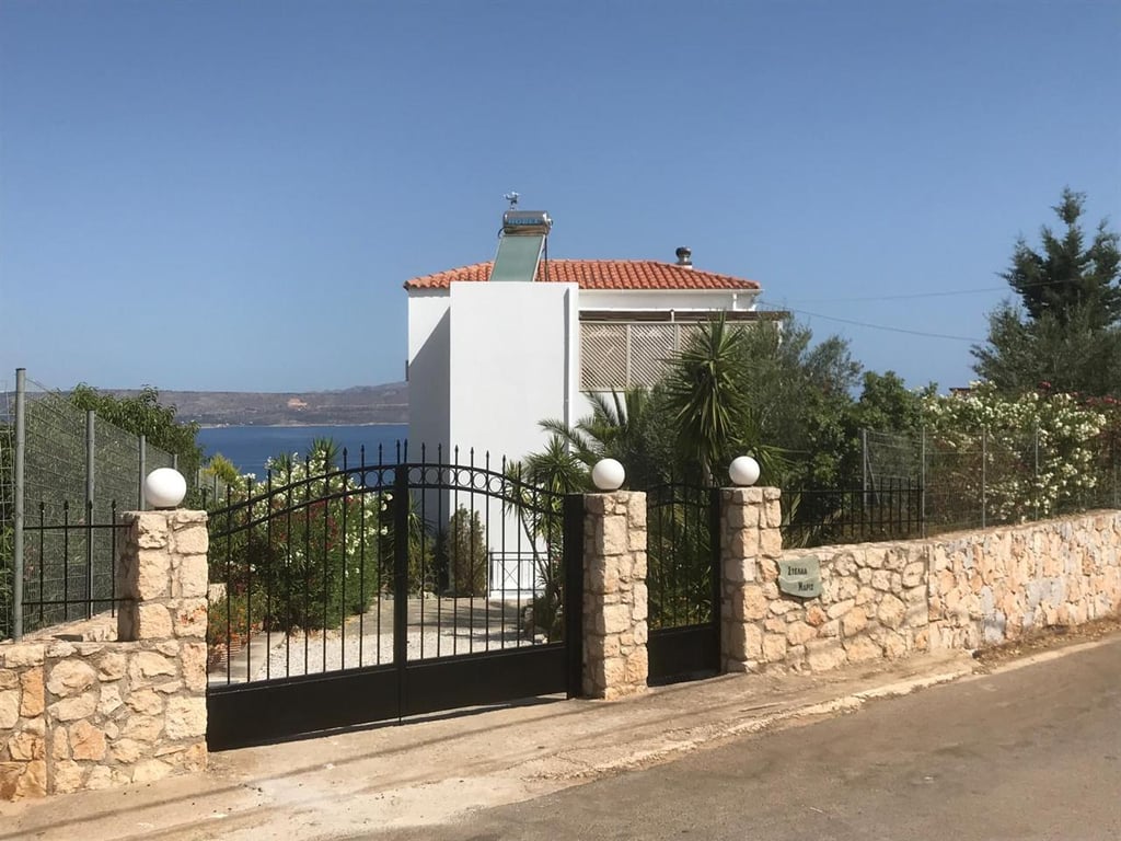 This beautiful villa with endless views of the sea and sky has 3 bedrooms, 2 bathrooms, private heated swimming pool plus basement, and is in a prime location just 7 minutes drive to Almyrida Beach.Ground floor: the front door leads to the open plan living area. The lounge is to the right with log burning stove for the cooler winter nights. Glass patio doors provide views of the sea out to Akrotiri peninsular across the pool, from the covered terrace accessed also from the conservatory.The fitte...